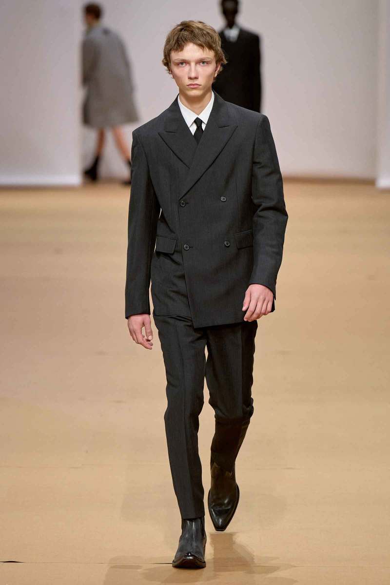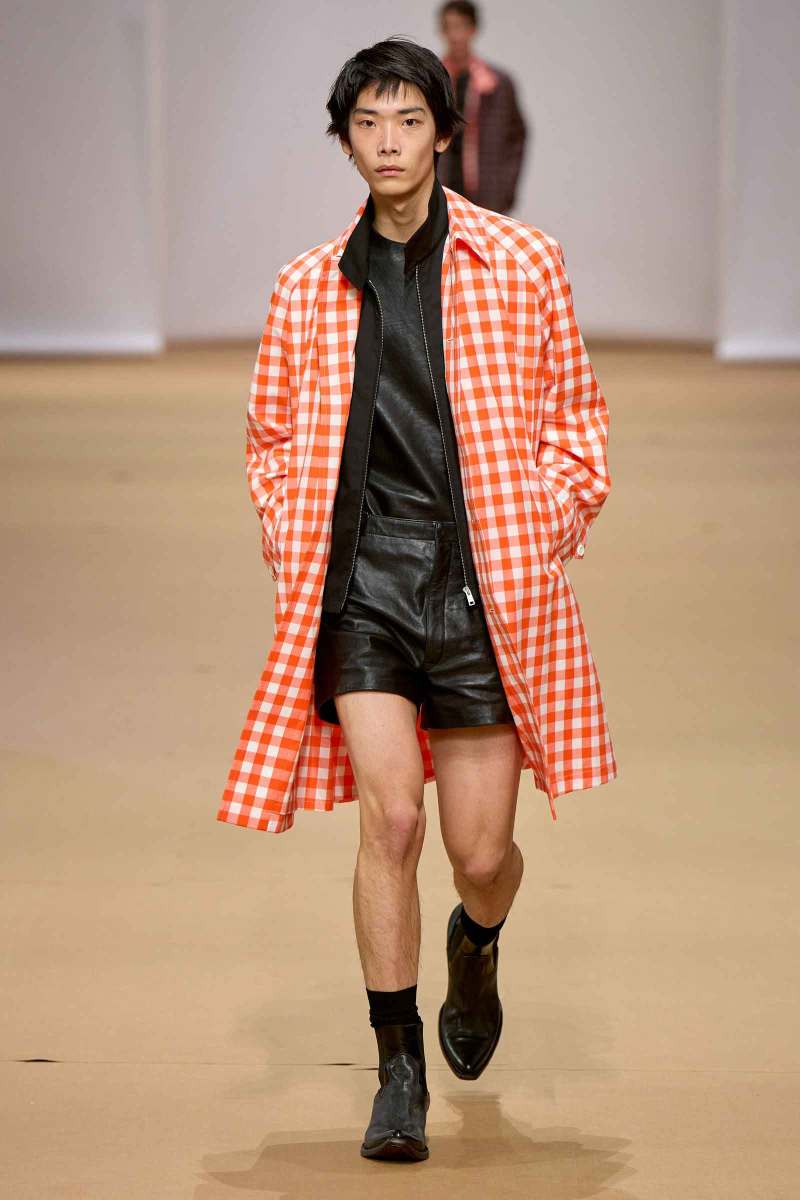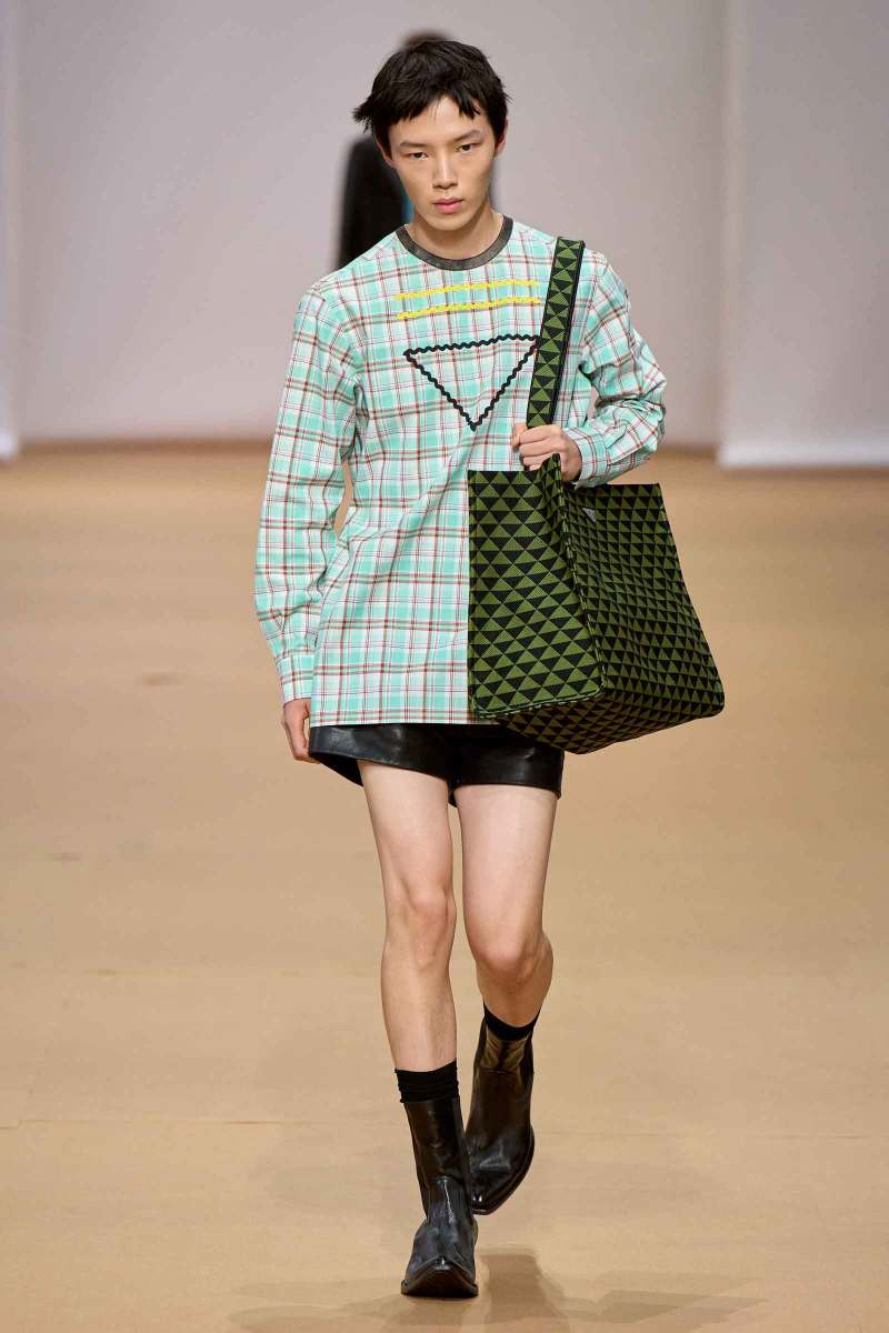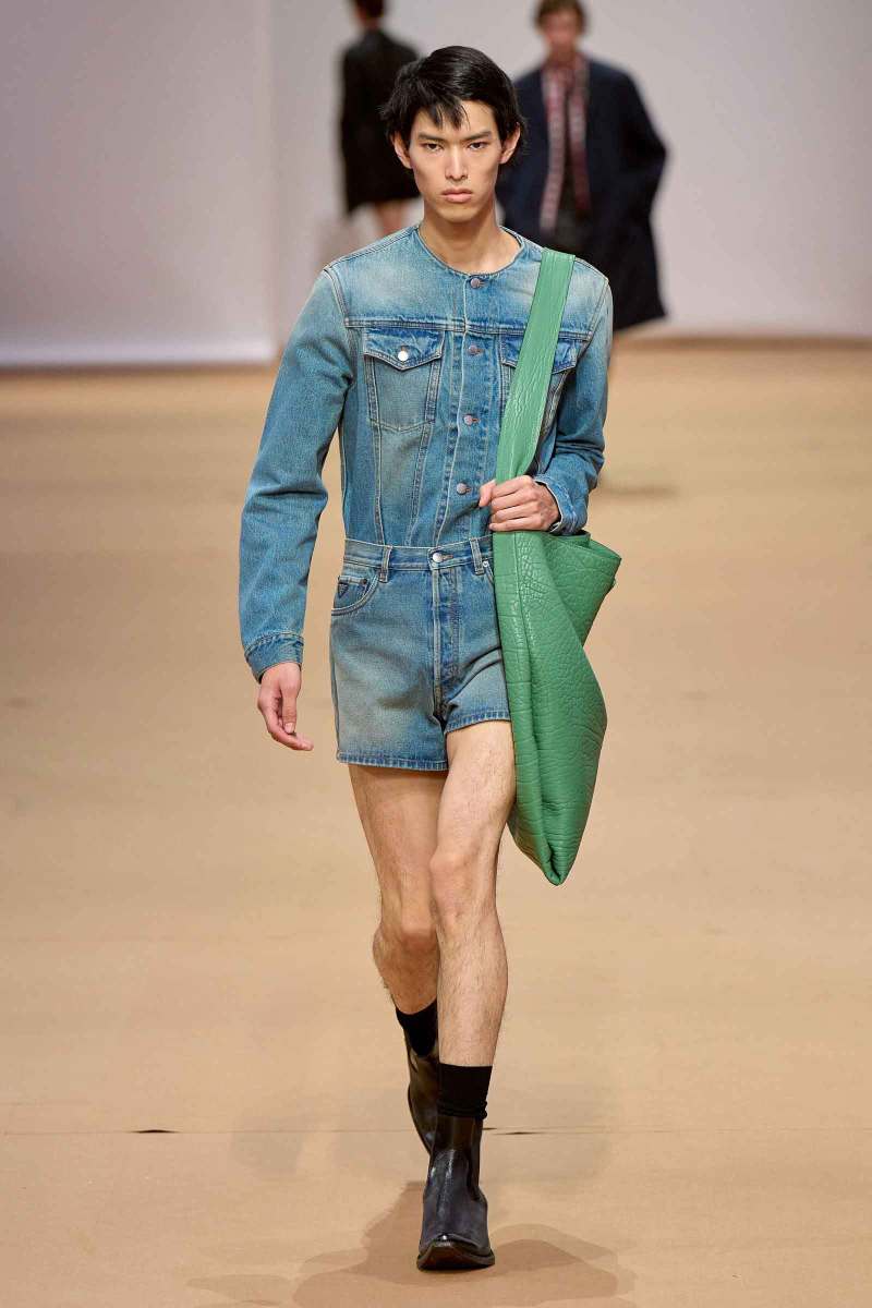 Gli abiti, i maglioni, il total denim, le camicie, le borse oversize e la pelle sono gli elementi che hanno dominato i look, ognuno prendendo posto nell’abbigliamento maschile. Questi capi sono diventati l’argomento per comprendere la complessità che comporta la loro creazione, facendo riferimento agli origami che si aprono rivelando un soprabito o una camicia a quadri.