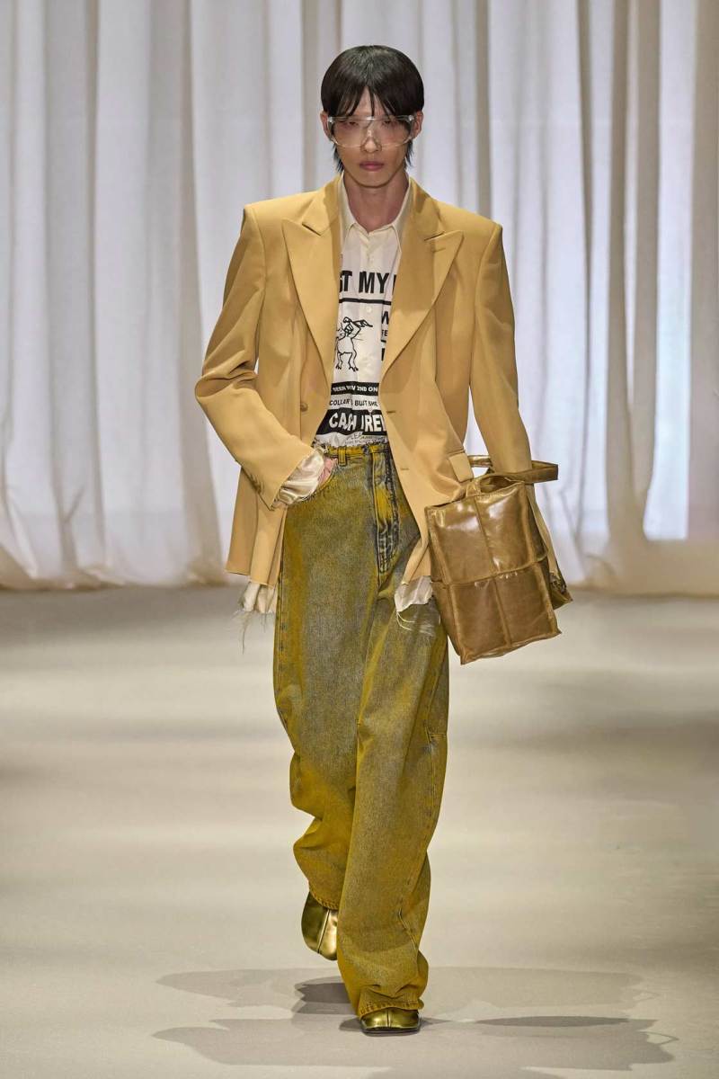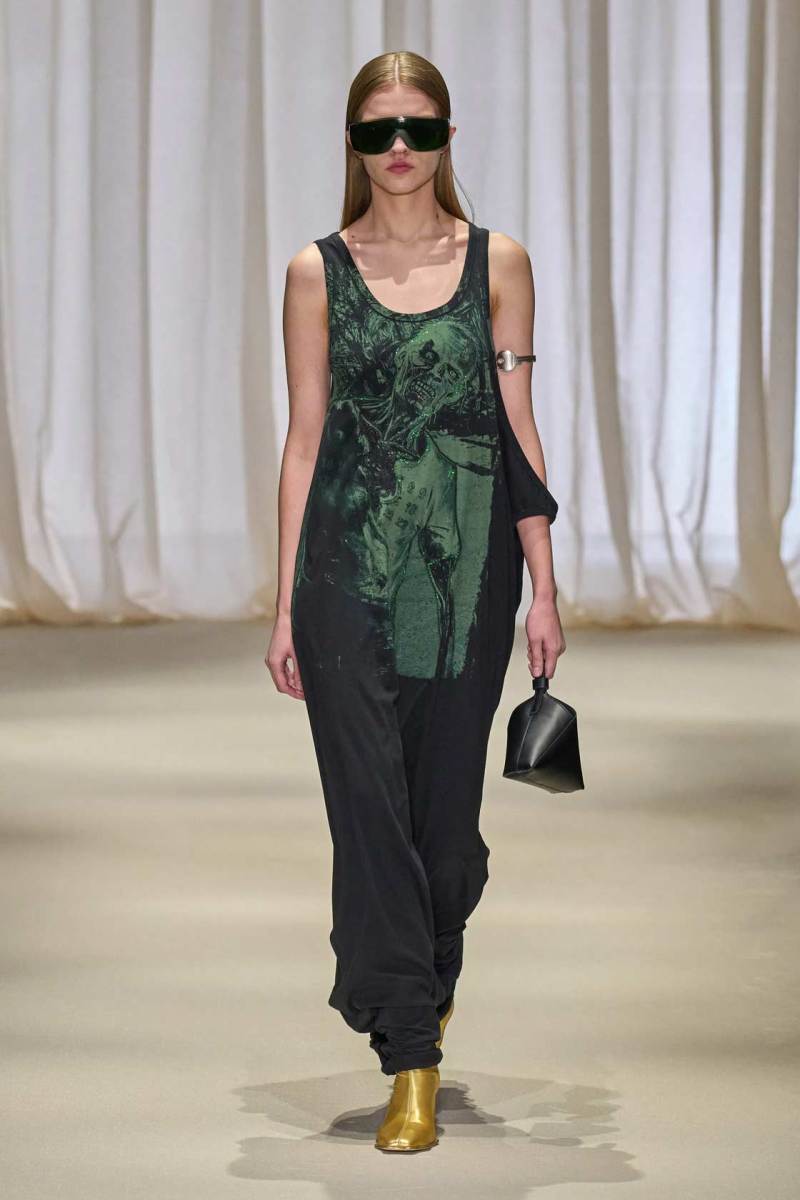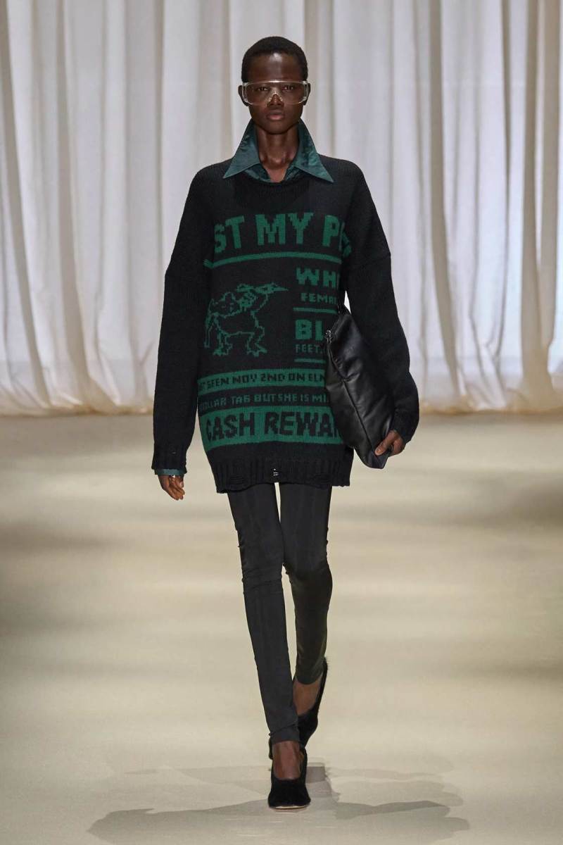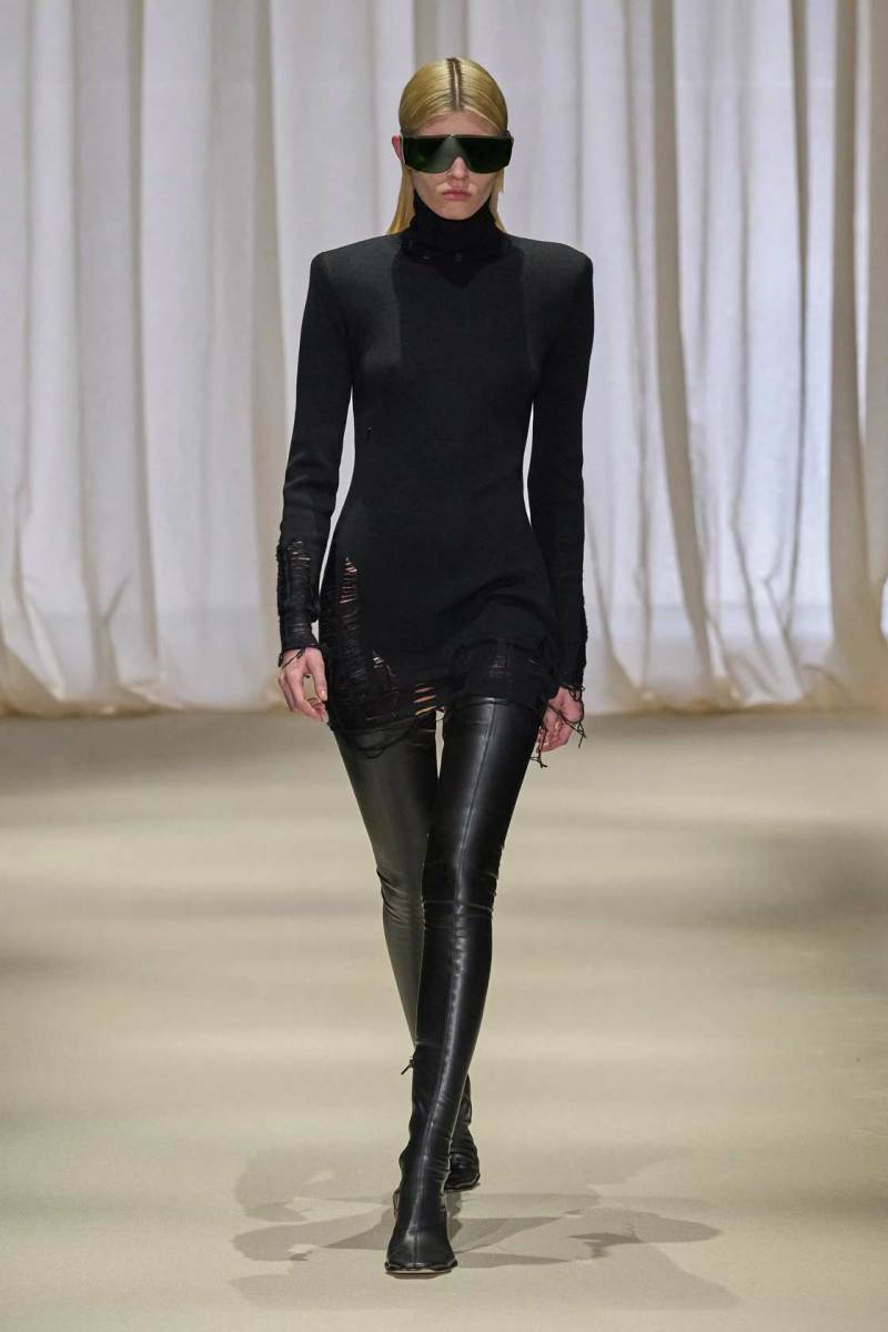 La collezione è ben riuscita. Vediamo riprendere dei cavalli di battaglia della Maison: borse origami, orli non rifiniti, maglie jacquard, maxi cappotti (hit 2024 e sicuro anche 2025) e scuba-boots cuissardes. Vediamo tantissima pelle e spalline imbottite anni ’80, pillow bags, spille da balia colorate, e il trench di pelle lungo fino ai piedi non ci abbandonerà nemmeno questa stagione. La palette di colori varia dai più chiari al total black mantenendo in equilibrio su quella dicotomia tra il futuristico e il canonico, il passato e il futuro. Ci hanno sorpreso vivaci tonalità viola e gialle su dolcevita aderenti, che sono diventati i pilastri per completi eccentrici abbinati a soprabiti sofisticati e denim strappato che ha fatto da padrone per questa collezione. Vediamo ancora giacche con colletto, stivali alti fino alla coscia (sexy) e il gilet un po’ combat che se abbinato a occhiali da sole “veloci” è perfetto per un evento techno o un rave. In tutto questo, noi stiamo fremendo per la prossima uscita della collaborazione del marchio streetwear Supreme, in programma a breve.
