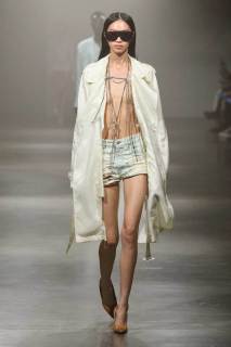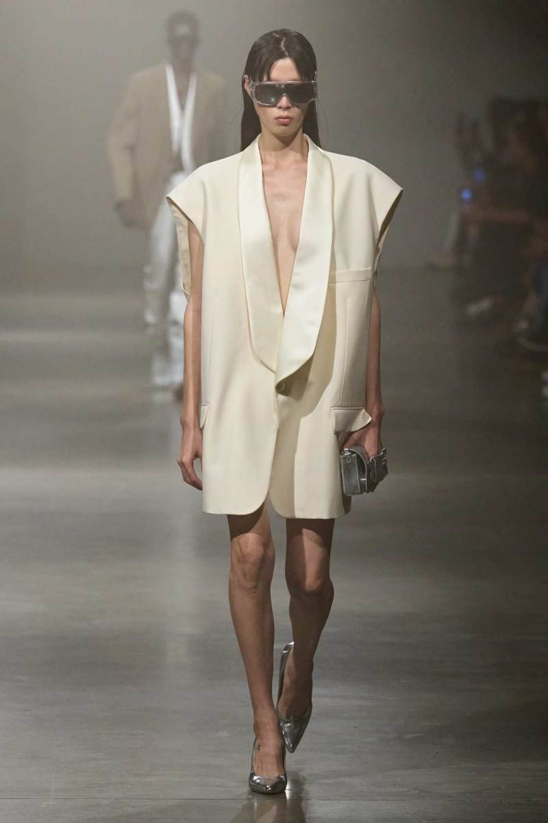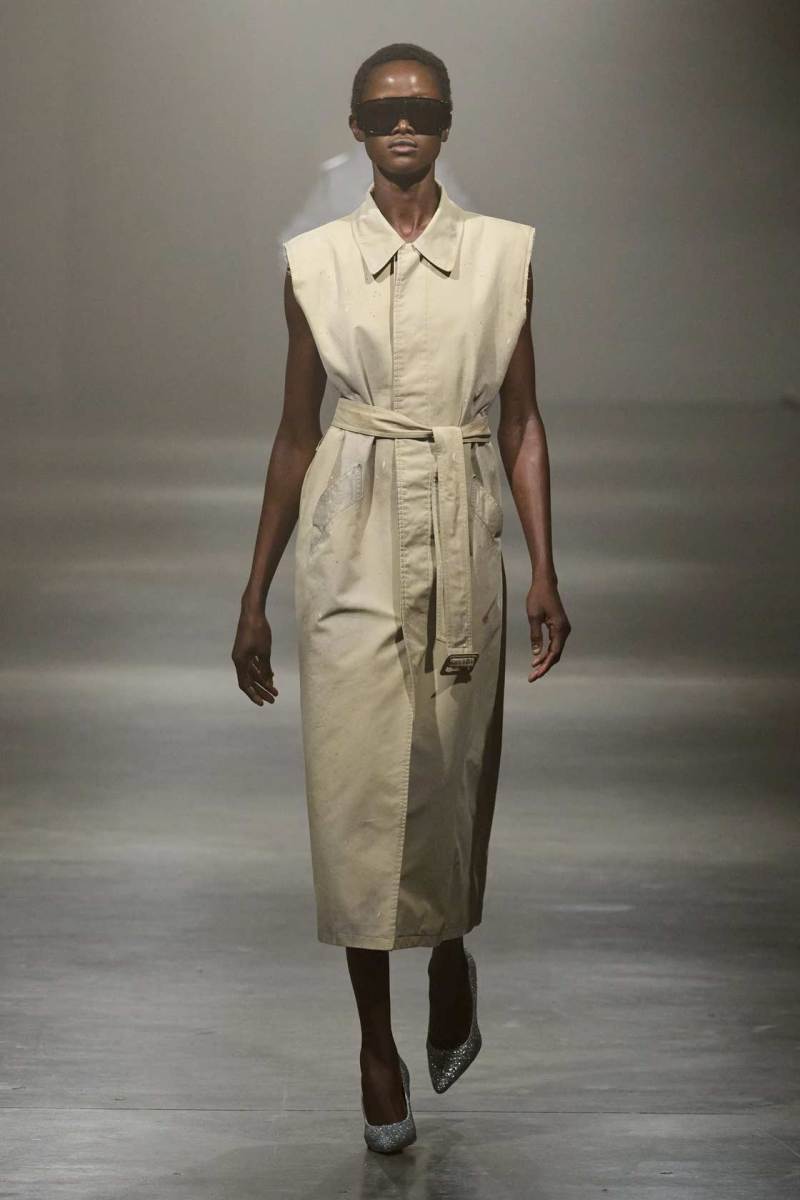 La passerella si illumina sotto le luci soffuse dello show, ed entra subito in scena il primo look: un coat bianco che arriva a metà gamba, dotato di bottoni chiusi sul davanti e che funge da vestito. Gli occhiali da sole rendono l’outfit più vibrante, e le scarpe color oro si intonano perfettamente alla clutch esibita dalla modella. Il secondo look, prettamente maschile, si articola in un gilet bianco abbinato, poi, a dei pantaloni del medesimo colore e ad una giacca color cachi. La musica ritmata ci presenta anche i pezzi seguenti della collezione, quali i vestiti gilet, trench corti ed ensemble tipicamente maschili.