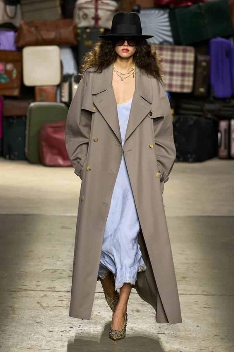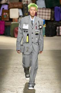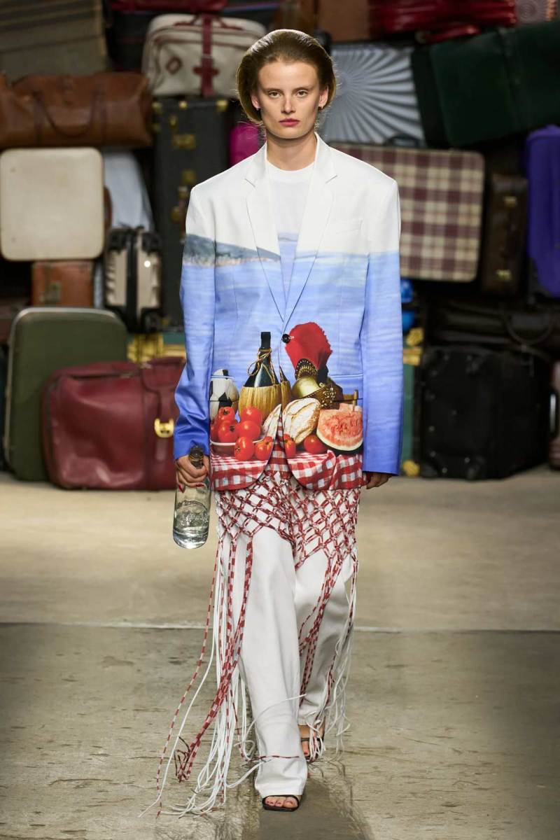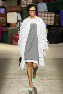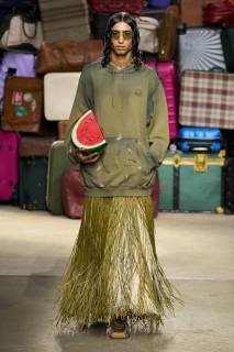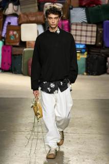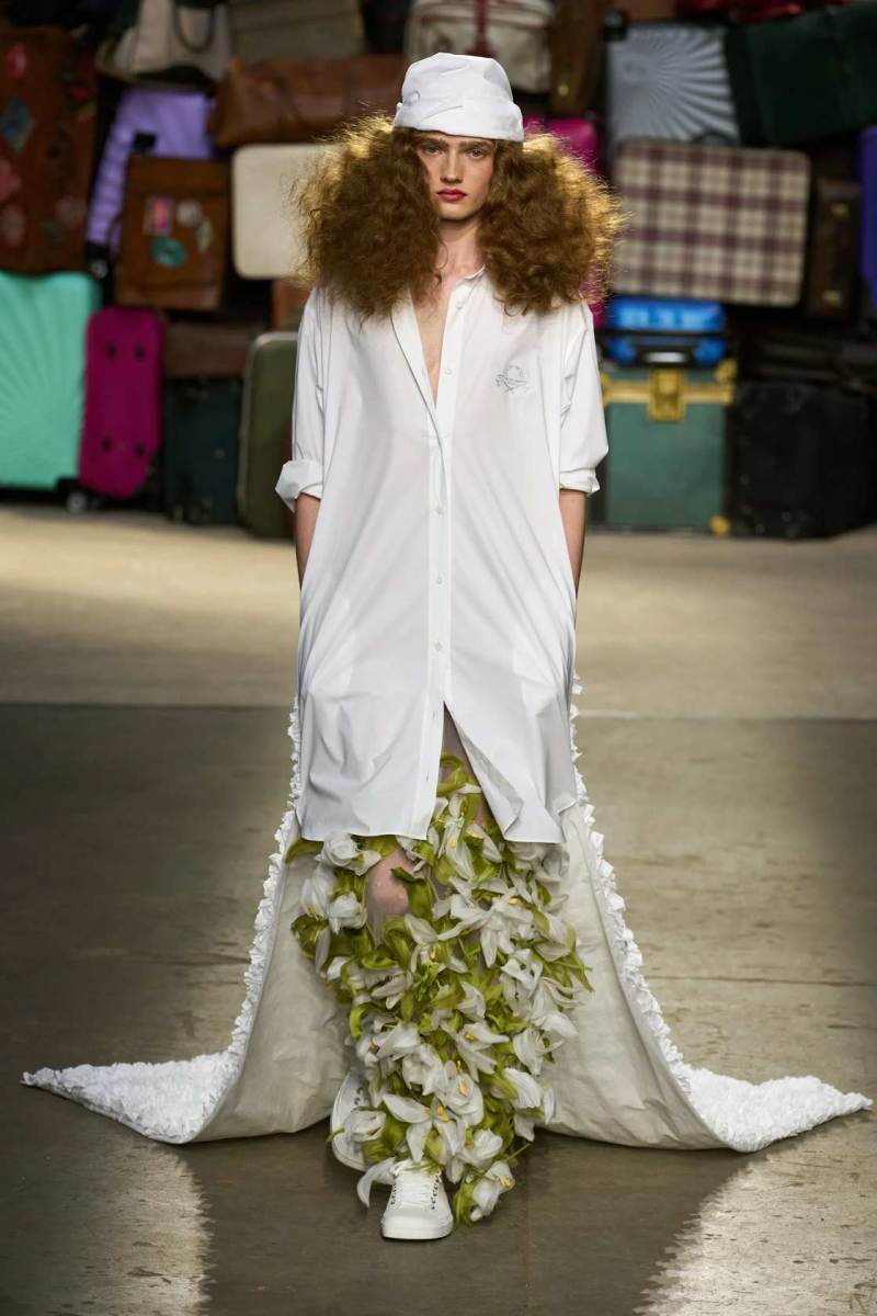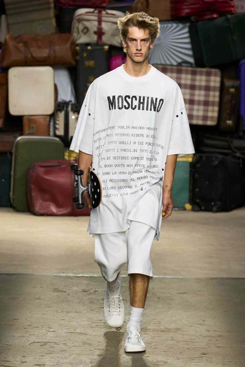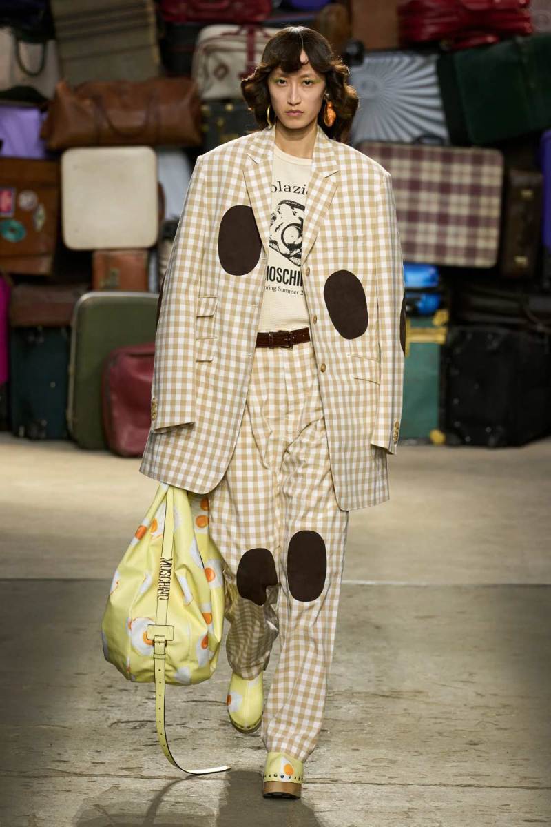 Moschino si rinnova, è un brand eclettico, innovativo, creativo, ma non nega il suo passato e i valori iconici di sempre; proprio per questo, anche questa volta non mancano riferimenti a capi iconici del brand, che vengono qui rivisitati: tra questi spiccano la pelliccia di Tyvek, le stampe iconiche, gli abiti lingerie, le macchie di sugo, le bandiere italiane, i trench coat.