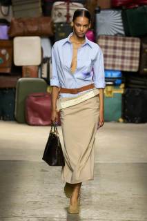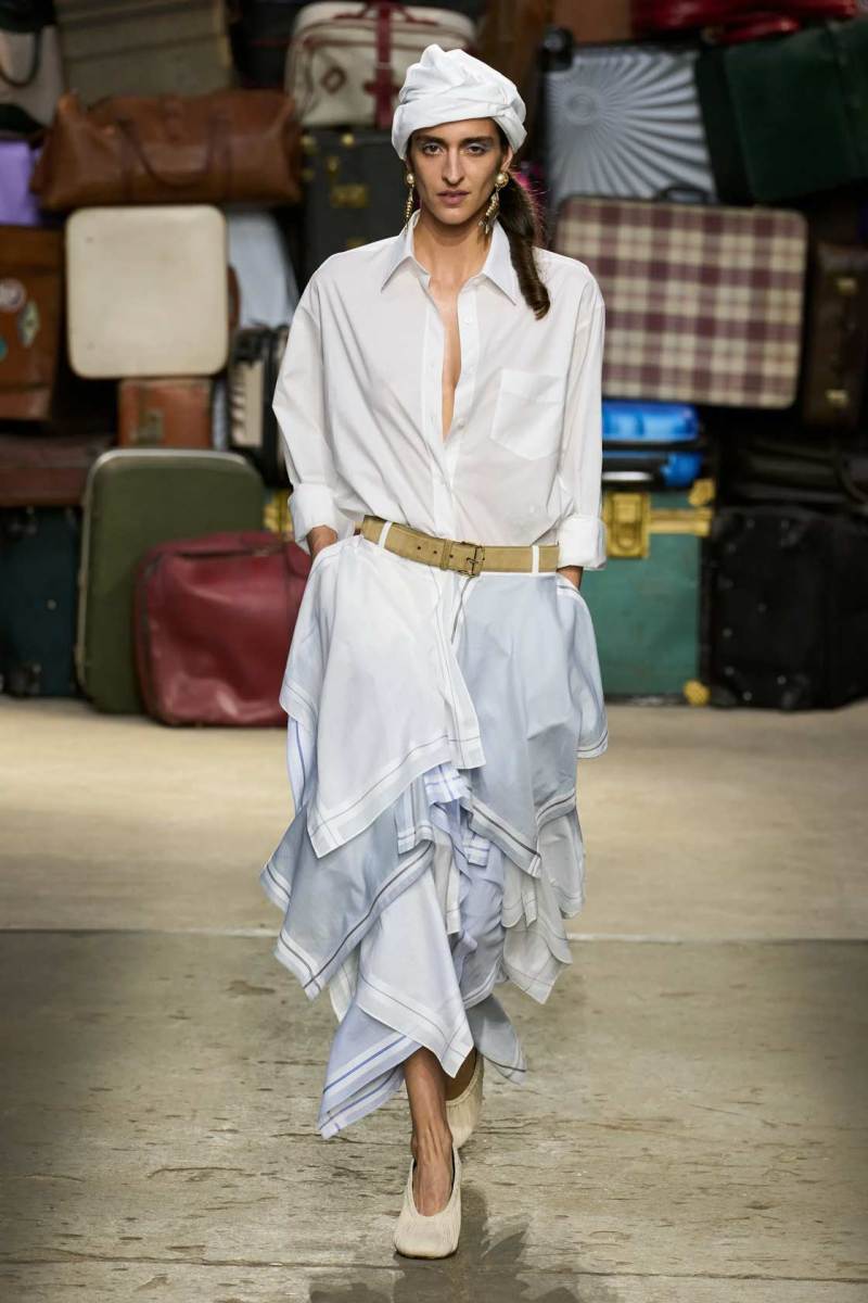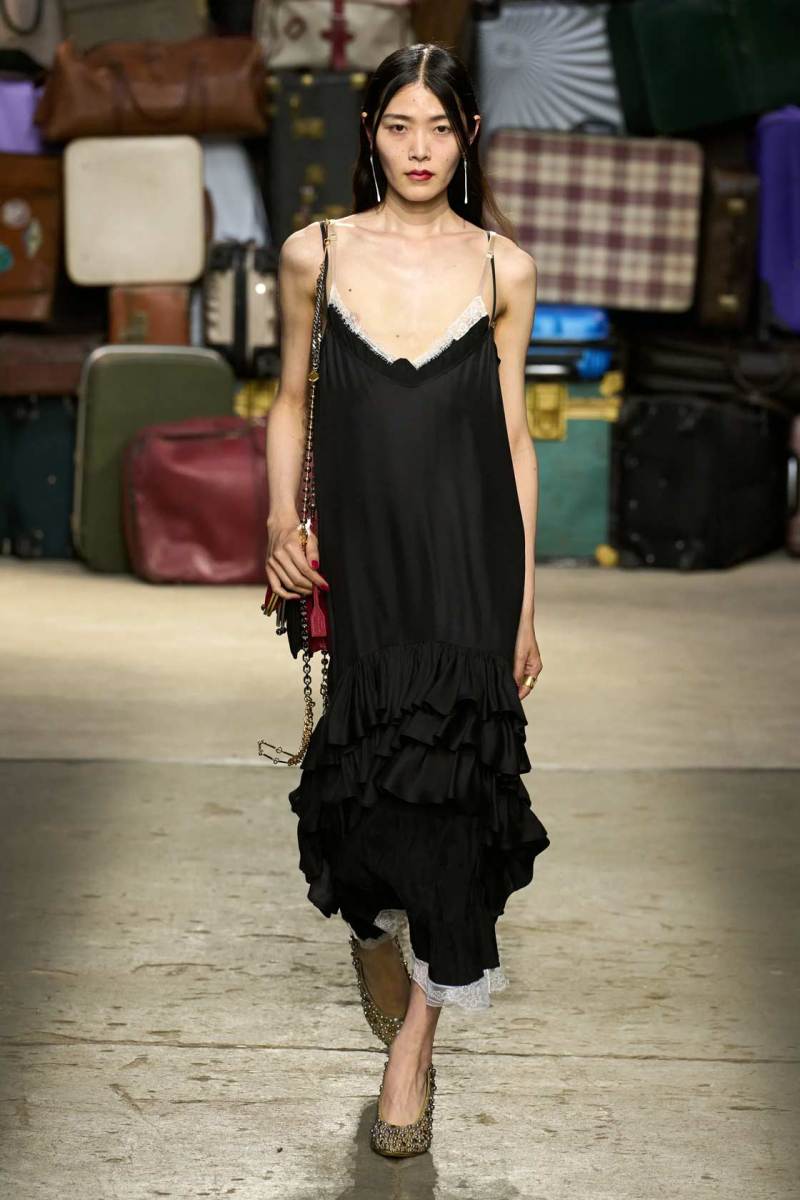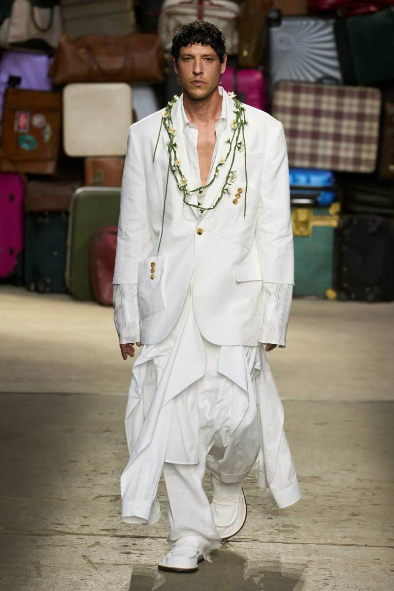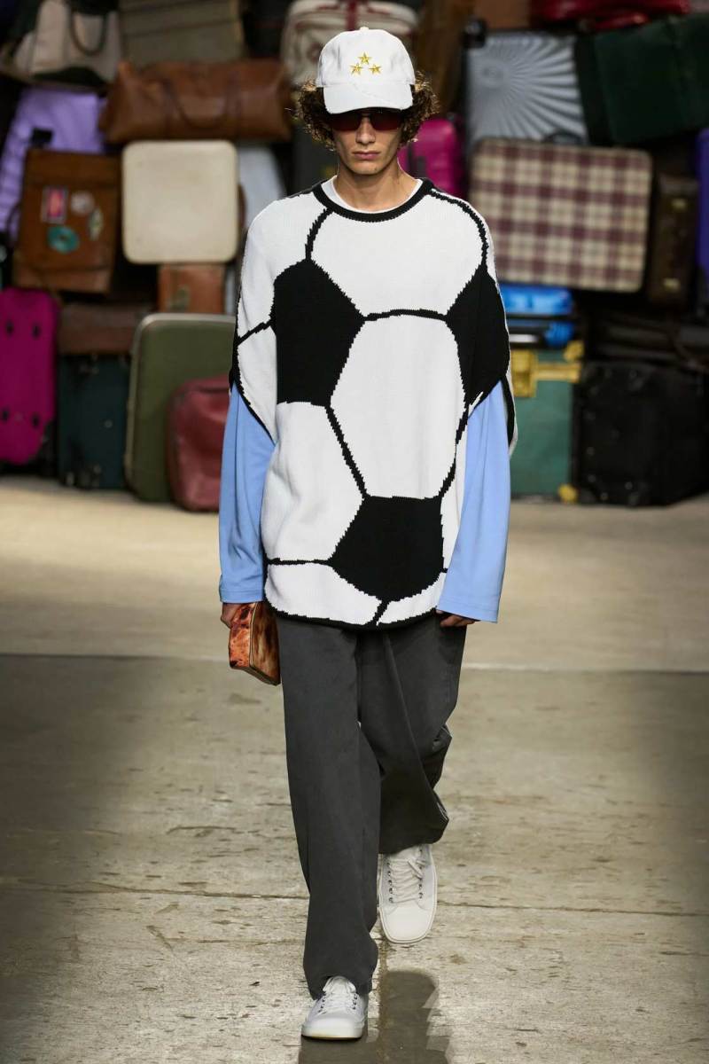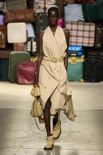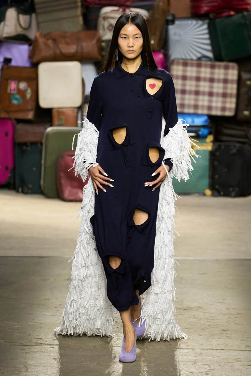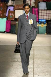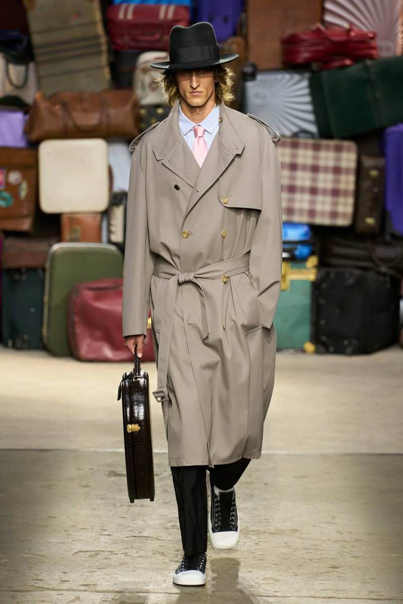 Moschino si rinnova, è un brand eclettico, innovativo, creativo, ma non nega il suo passato e i valori iconici di sempre; proprio per questo, anche questa volta non mancano riferimenti a capi iconici del brand, che vengono qui rivisitati: tra questi spiccano la pelliccia di Tyvek, le stampe iconiche, gli abiti lingerie, le macchie di sugo, le bandiere italiane, i trench coat.