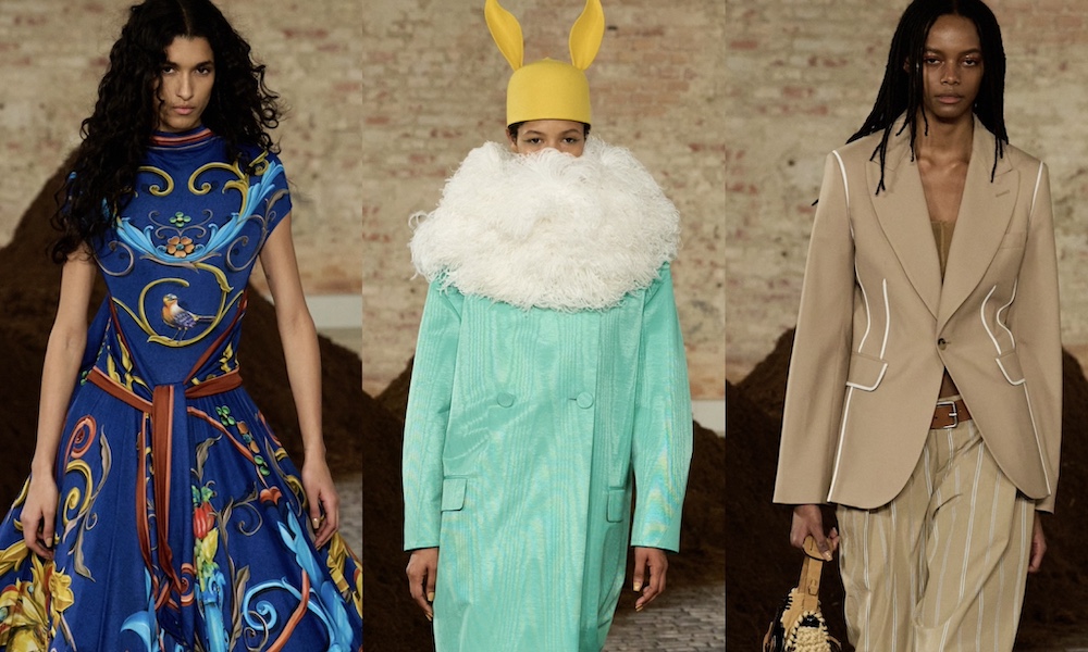 Accanto agli elementi più ironici emergono capi che rivelano una forte attenzione alla costruzione sartoriale. Tra i look più significativi compaiono abiti stampati con motivi equestri, pantaloni ispirati all’abbigliamento gaucho e giacche dal taglio anni Quaranta abbinate a look coordinati per lui e per lei.