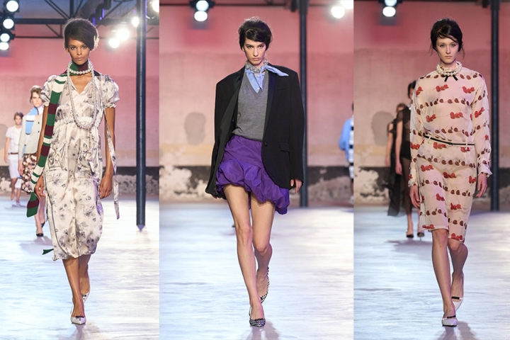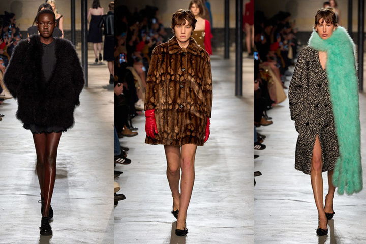 La camicia dal taglio maschile a righe è sicuramente l’elemento protagonista di questa collezione. Da portare con tutto e in qualunque modo. Anche i capi spalla sembrano camicie ingigantite e impreziosite da spille da balia che formano corolle di fiori. Abiti sexy con scollature a cuore e completi di paillettes verde brillante e dai colori accesi. Inoltre, sono presenti cardigan lavorati con punto pelliccia infeltrito e con grandi bordi di piume. Una collezione che si allontana dai canoni tradizionali e che impone un punto di vista nuovo e alternativo. Il tutto per costruire una silhouette eccentrica e anticonformista.