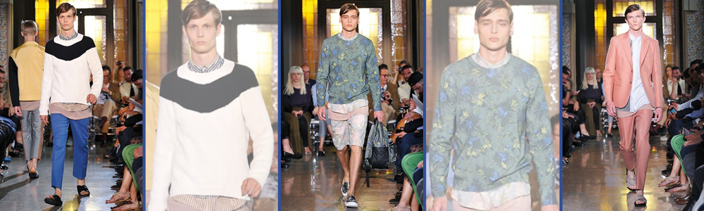 Pantaloni dal taglio sartoriale e bermuda vengono abbinati a t-shirt, camicie e cardigan per ricreare un gioco di volumi in sovrapposizione, volendo ricreare trasparenza e freschezza. Grande attenzione ai materiali: dal cotone semplice a quello lavorato a intarsia a righe orizzontali con stampe botaniche e jacquard, tessuti vichy, leggerissimo jersey, pelle, denim e persino raso e seta.