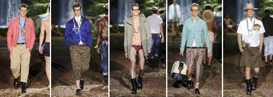 Nella giungla tropicale il clima è torrido e le giacche vanno ampie con camicie dal collo notched (minimo), portate rigorosamente a caso, fuori dai pantaloni. Una versione ancora più casual, i bermuda sempre dai dettagli e dalle tasche grandi militari, portati assieme a magliette dai motivi etnici e a giacche stampate con pappagalli, coccodrilli, leoni, scimpanzé, maschere tribali in 3D e inserti stracciati di pelle.