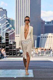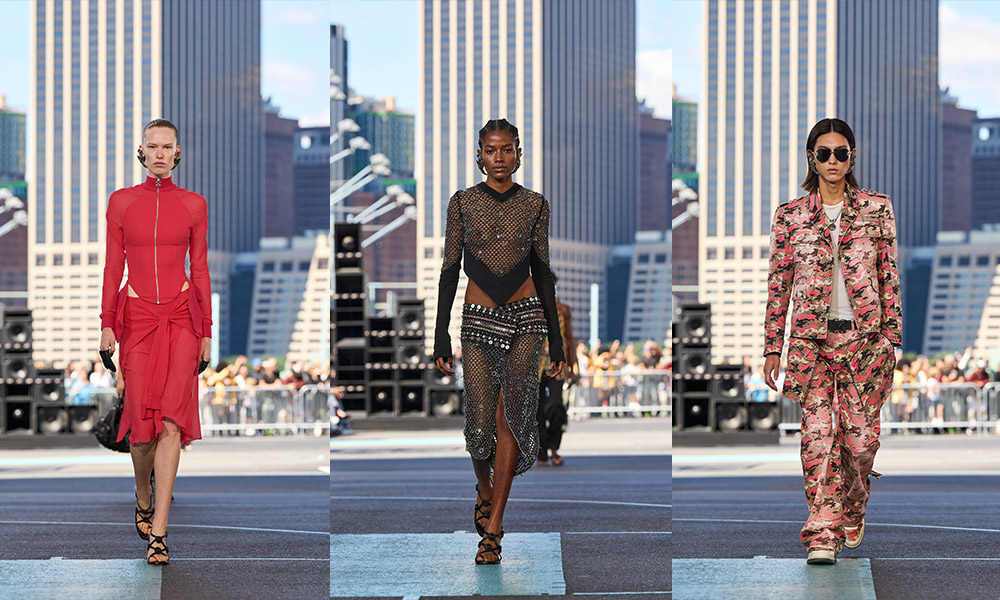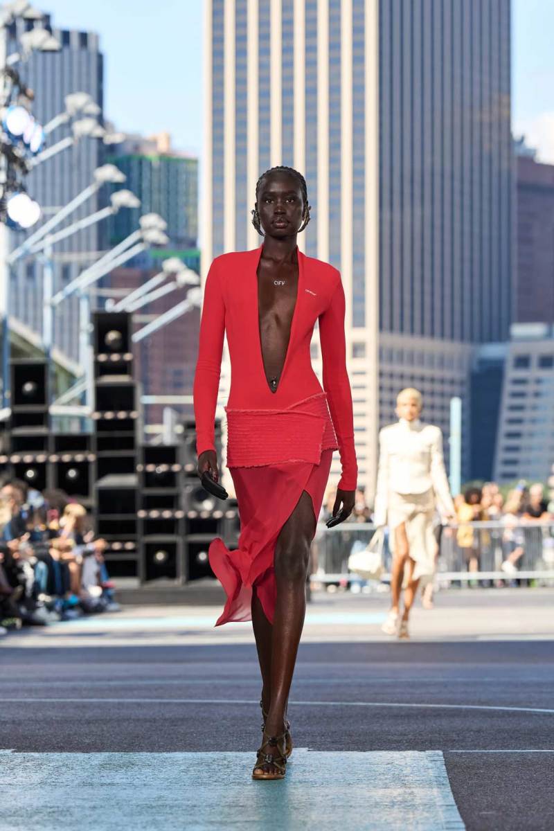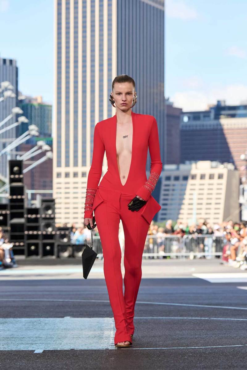 La collezione PE 2025 di Off-White fonde perfettamente l’athleisure con un tocco sensuale. Body e leggings, arricchiti da profonde scollature a V e spacchi audaci, sono stati abbinati a sandali con tacco a spillo, definendo uno stile sporty-chic dalle linee femminili e provocatorie. Il look si è completato con giacche sportive indossate sopra gonne midi e accessoriate con un’ulteriore giacca annodata in vita, per un effetto rilassato e low-key.