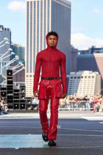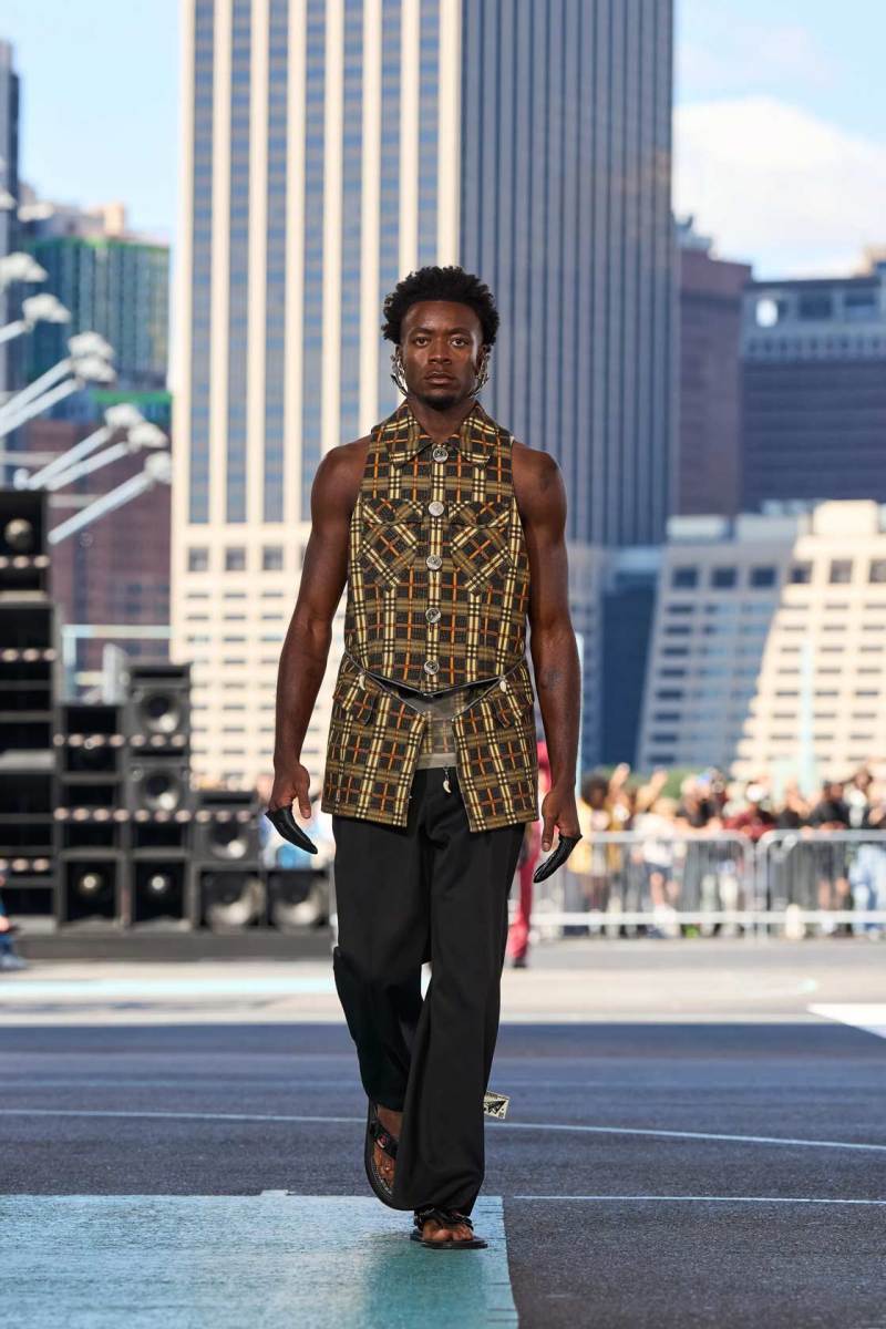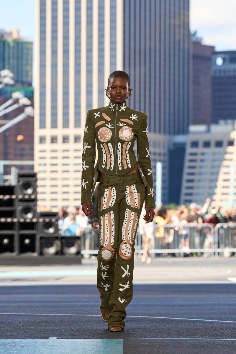 Kamara ha mostrato anche una particolare attenzione per l’abbigliamento maschile, introducendo tasche utility in vita per un uomo pratico ma sempre attento allo stile. Non è mancato un tributo all’arte ghanese, con capi che raffiguravano opere dell’artista Nana Danso, aggiungendo un ulteriore livello di profondità culturale alla collezione.