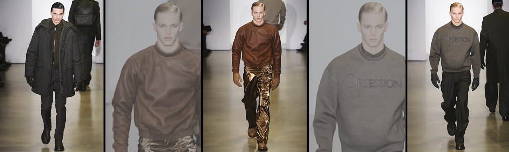 Le parole “Obsession”, “Eternity” e “Escape” campeggiano sulle felpe che calcano la passerella di Calvin Klein della collezione Uomo Autumn/Winter 2014-2015, a rievocare i nomi delle più conosciute fragranze CK.