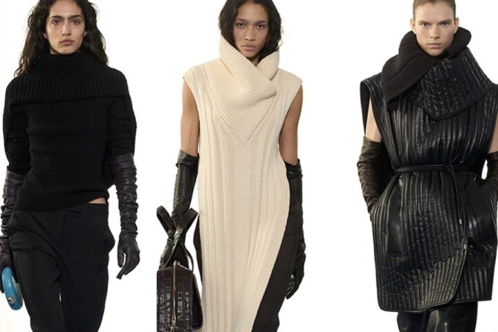 La collezione si compone di costruzioni sartoriali ed esaltazione dei corpi, materiali super stretch e aderenti come una seconda pelle in omaggio alle tre decadi d’oro del power dressing: gli anni ’40 con la giacca a clessidra, gli anni ’80 dalle spalle esagerate abbinate a pencil skirt, e gli anni ’90 caratterizzati da uno stile androgino e minimalista.