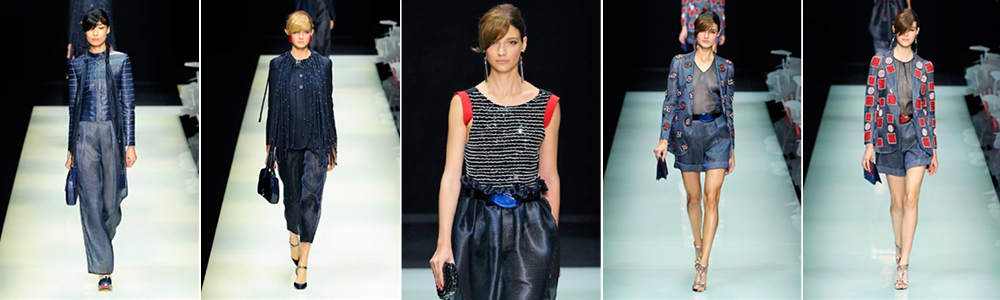 Tonalità di rosso, dal lacca al geranio, sono abbinate al blu navy, al bianco, al grigio lunare per uno stile marinière classico. Se il rosso rappresenta una tinta inusuale per Giorgio Armani, il blu è il nuovo nero: meno duro e categorico, non manca di esprimere regalità ed eleganza, con rimando ai toni più profondi del mare. L’accessorio immancabile è il cappello a falda larga, che accresce il senso di mistero e sensualità, mentre le scarpe sono platforms con conturino alla caviglia e sandali intrecciati.