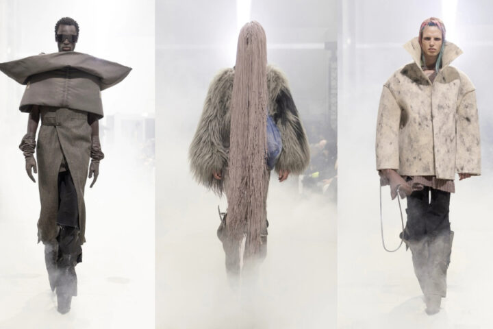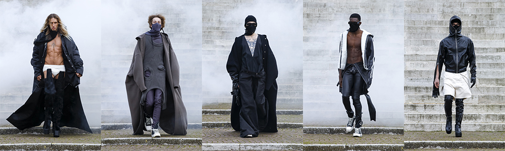 La rappresentazione di un mondo in distruzione. Applicata ai giorni nostri, la visione dello stilista potrebbe essere interpretata come un grido di preoccupazione; i capi di Rick Owens, infatti, ne sono la dimostrazione. Silhouette più avvolgenti si accostano a elementi sovradimensionati, i capi di maglieria vengono indossati dai modelli in maniera atipica perdendo la loro funzione primaria. Elementi contrastanti si avvicinano per dare un’accurata interpretazione dell’estetica del caos della struttura.