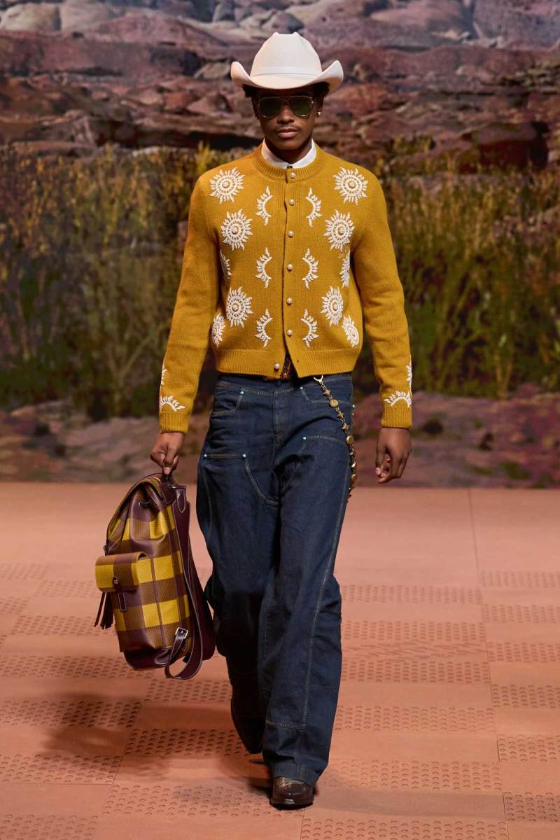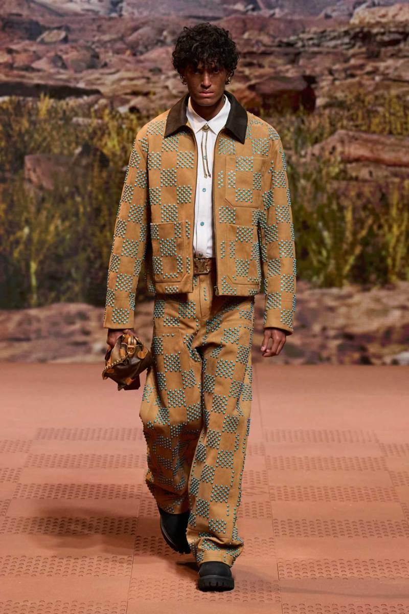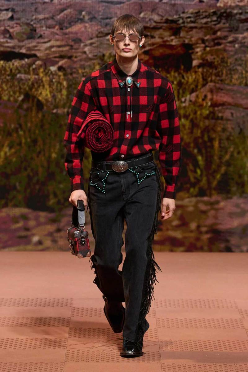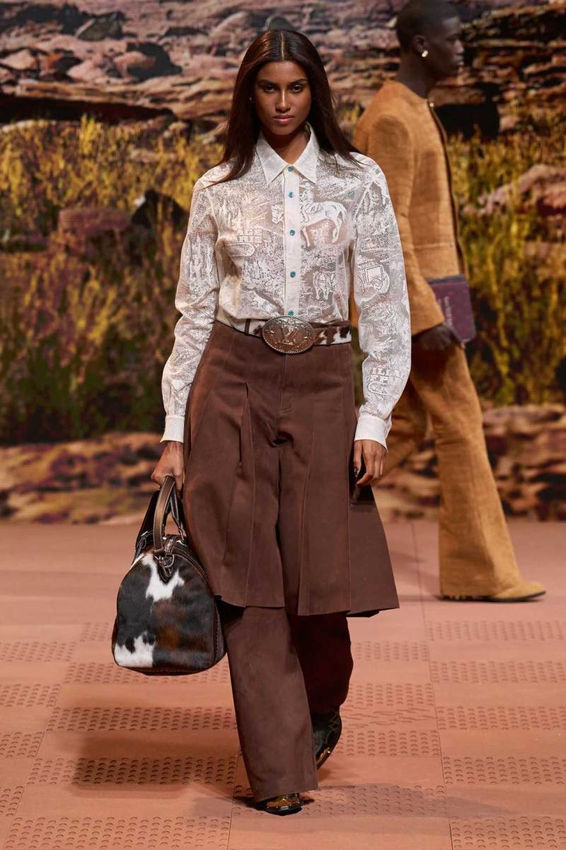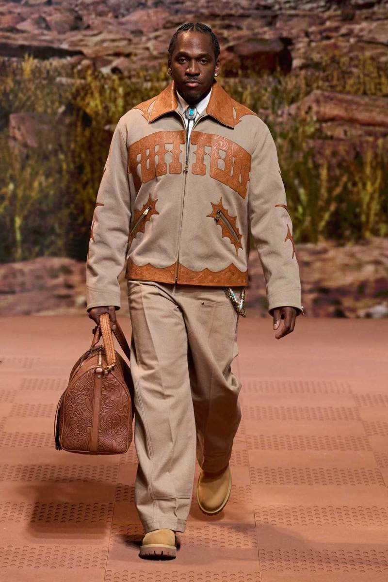 La straordinaria sfilata di Louis Vuitton a Parigi è stata un evento senza precedenti, con Pharrell Williams che ha dato vita a uno show spettacolare. Il tema della collezione si è ispirato ai nativi americani, fondendo elementi della loro cultura sia del passato che del presente. La passerella è stata trasformata in un suggestivo rodeo stile cowboy, con modelli che indossavano abiti decorati con frange, nappe e dettagli western distintivi.