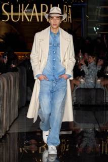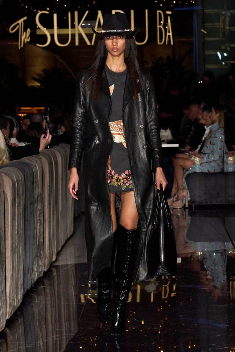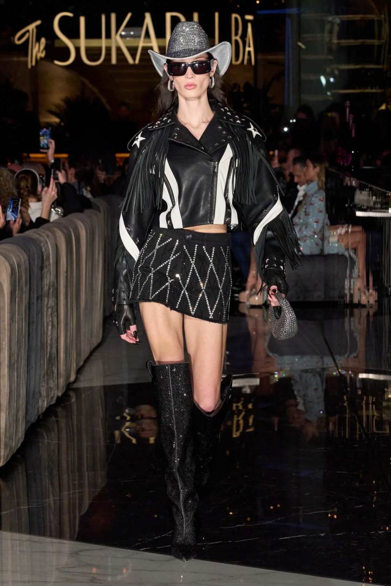 La collezione ha reinterpretato lo stile cowboy con l’inconfondibile audacia del marchio: giacche in pelle borchiata, denim strappato, frange e maxi fibbie hanno dominato la scena, mentre abiti scintillanti e dettagli in cristalli hanno aggiunto un tocco di opulenza. La palette cromatica ha alternato tonalità dark come nero e argento a dettagli in rosso fuoco, evocando il fascino ribelle del selvaggio West.
