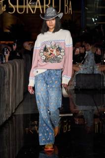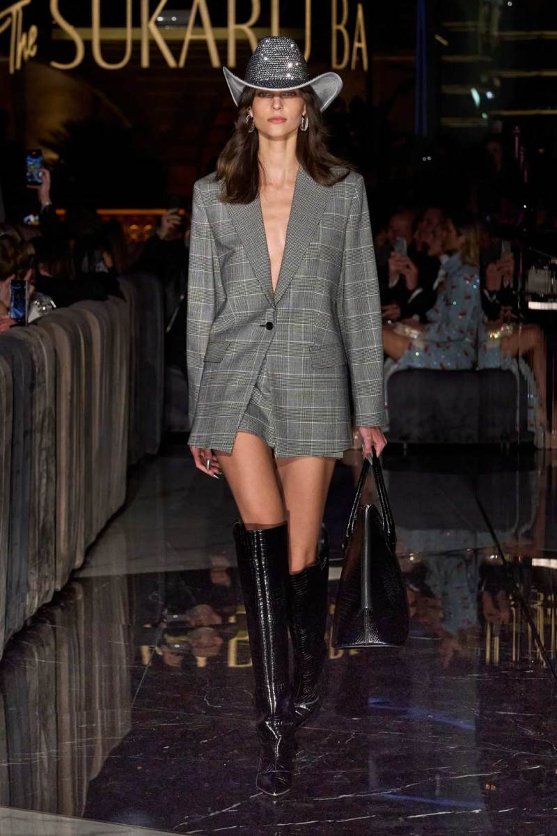 A rendere lo show ancora più spettacolare è stata l’integrazione di un toro meccanico direttamente sulla passerella: durante la sfilata, alcune modelle si sono cimentate nell’impresa di cavalcarlo, aggiungendo un tocco di adrenalina e teatralità alla presentazione della collezione. Un omaggio al mondo del rodeo che, reinterpretato in chiave glamour, ha reso la sfilata un evento senza precedenti.