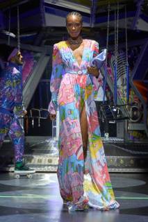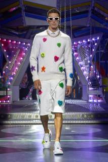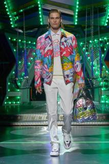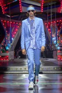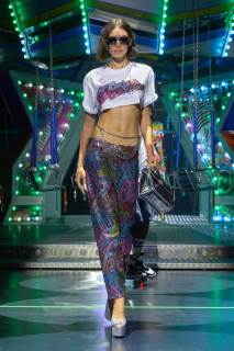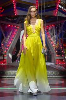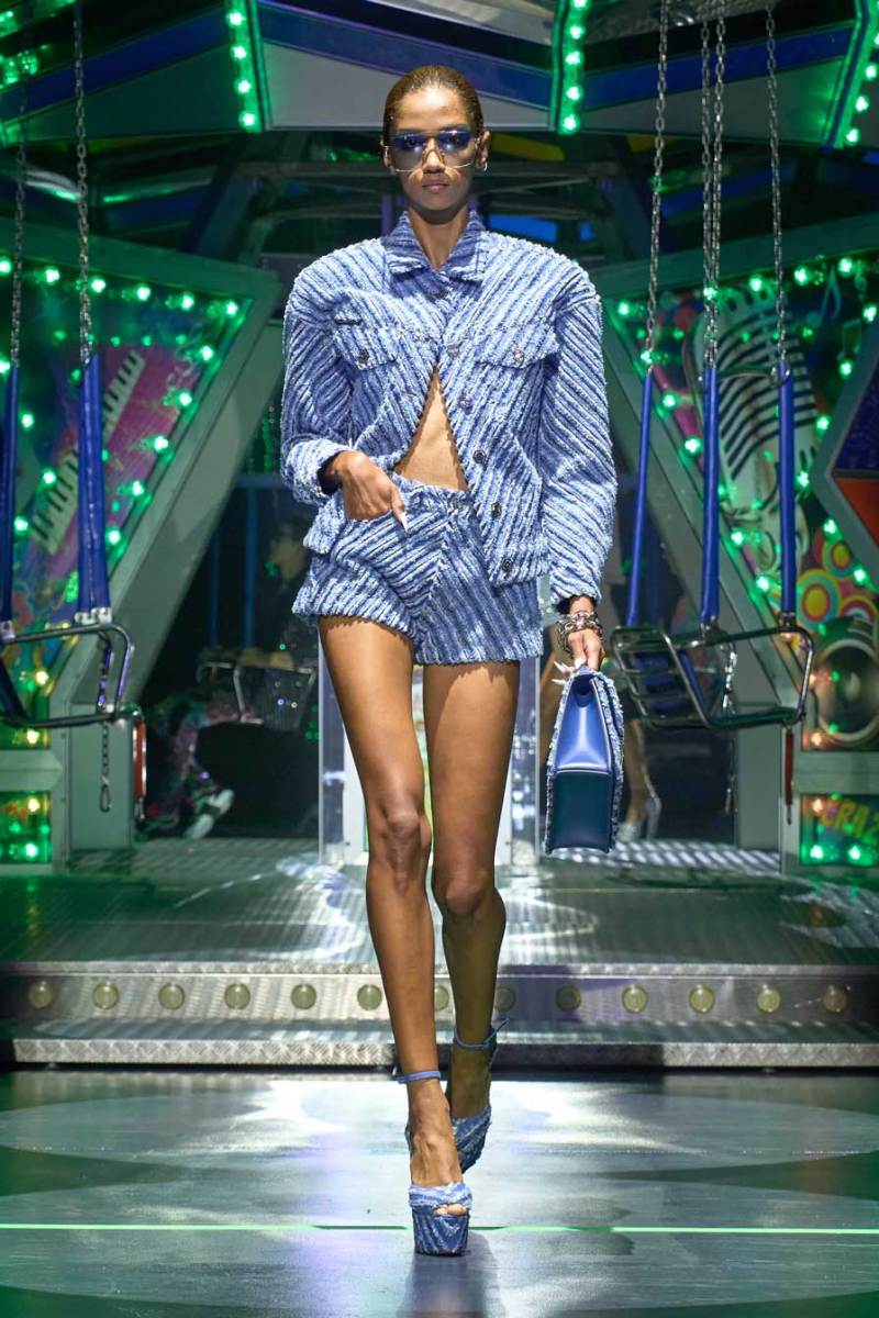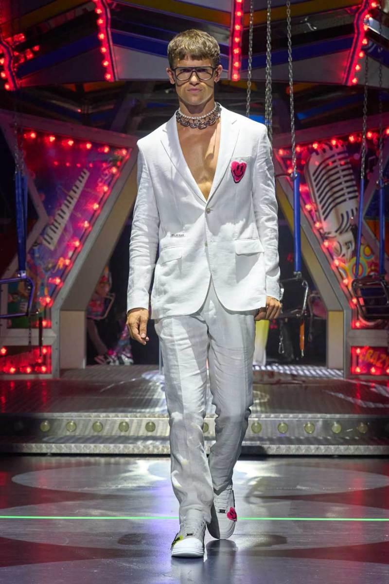 Una maxi-giostra al centro della passerella ha fatto da cornice al maxi evento con oltre 4000 ospiti. I passi della prima uscita cavalcano il ritmo dell’iconica canzone “Girls just wanna have fun”. La sfilata parte in quarta mostrando outfit con stampe che sprizzano colore da tutti i pori. Accessori rigorosamente in argento, tra maxi bag e tacchi high platform, accompagnano ogni look in questo fantastico scenario da luna park.