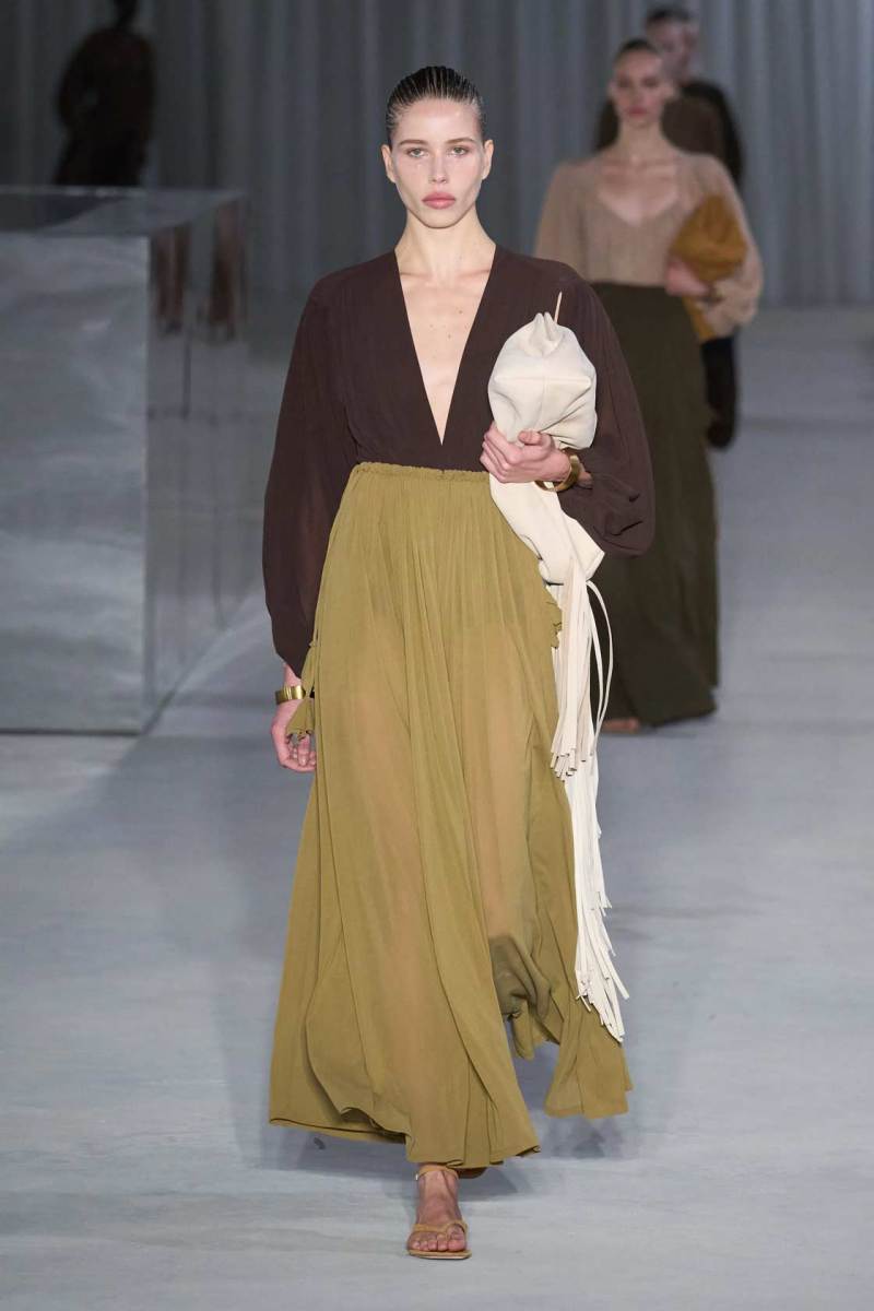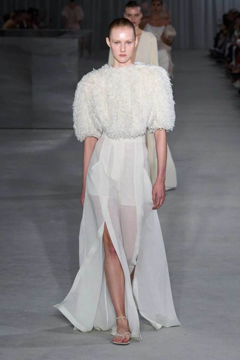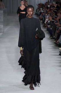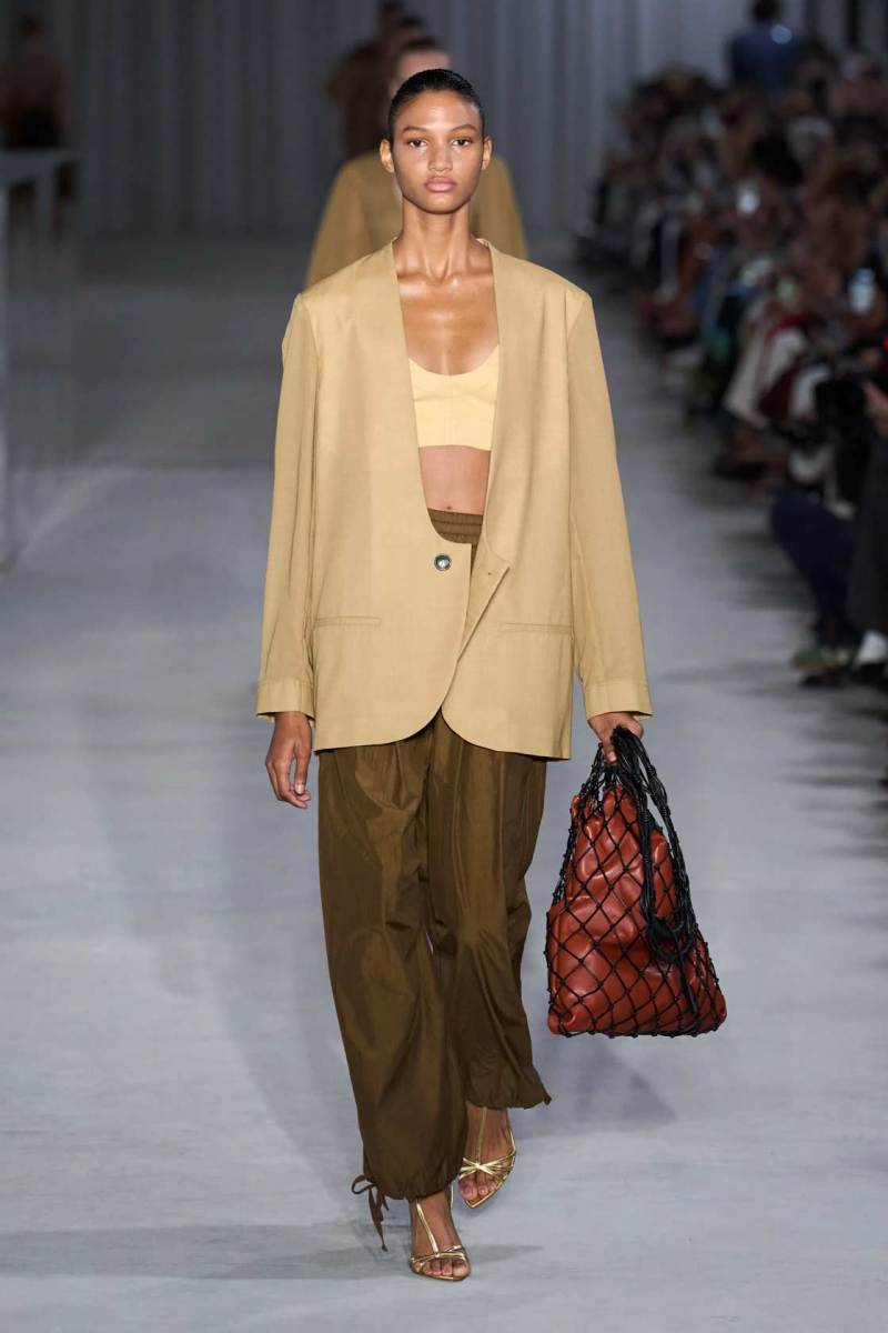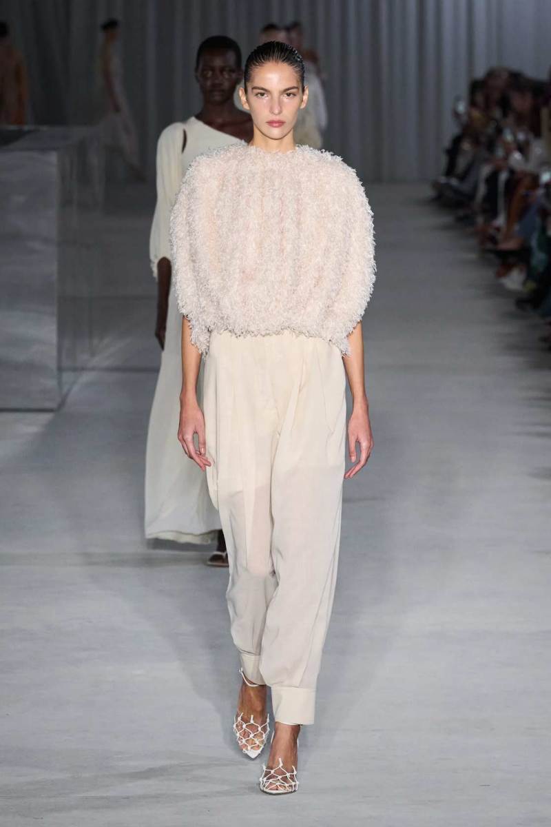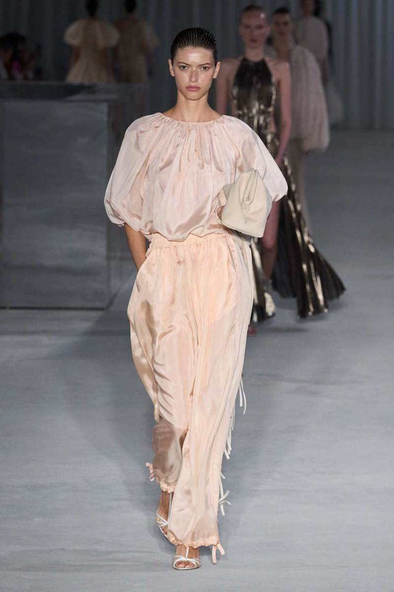 Troviamo trasparenze, pizzi, maniche a sbuffo, blazer dalla chiusura irregolare ma anche accessori di tendenza come tote a rete e grandi pouch scamosciate con lunghe frange. Gli elementi chiave per la PE25 di Lorenzo Serafini sono decisamente attuali e affascinano un pubblico dal gusto irresistibilmente minimal e all’insegna del comfort.
