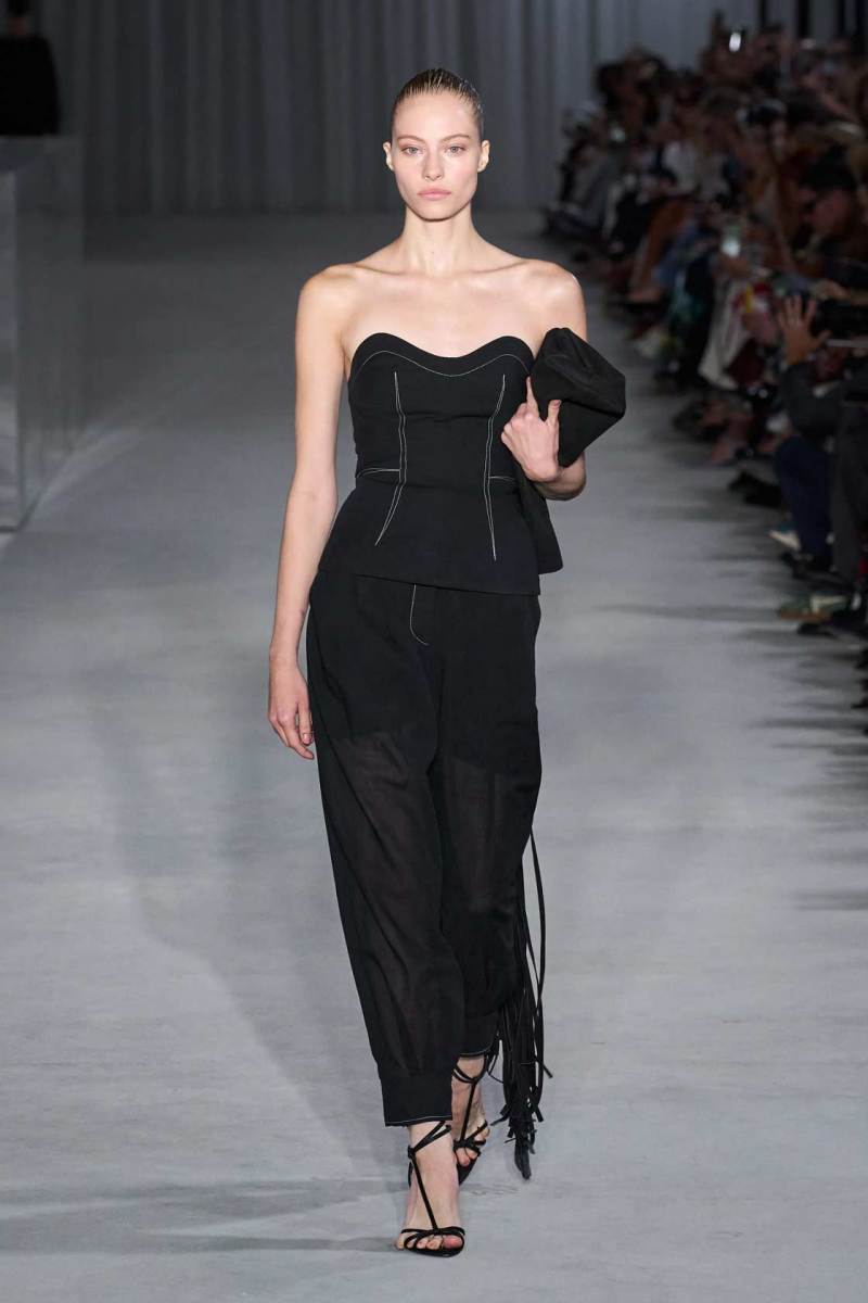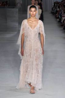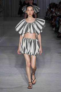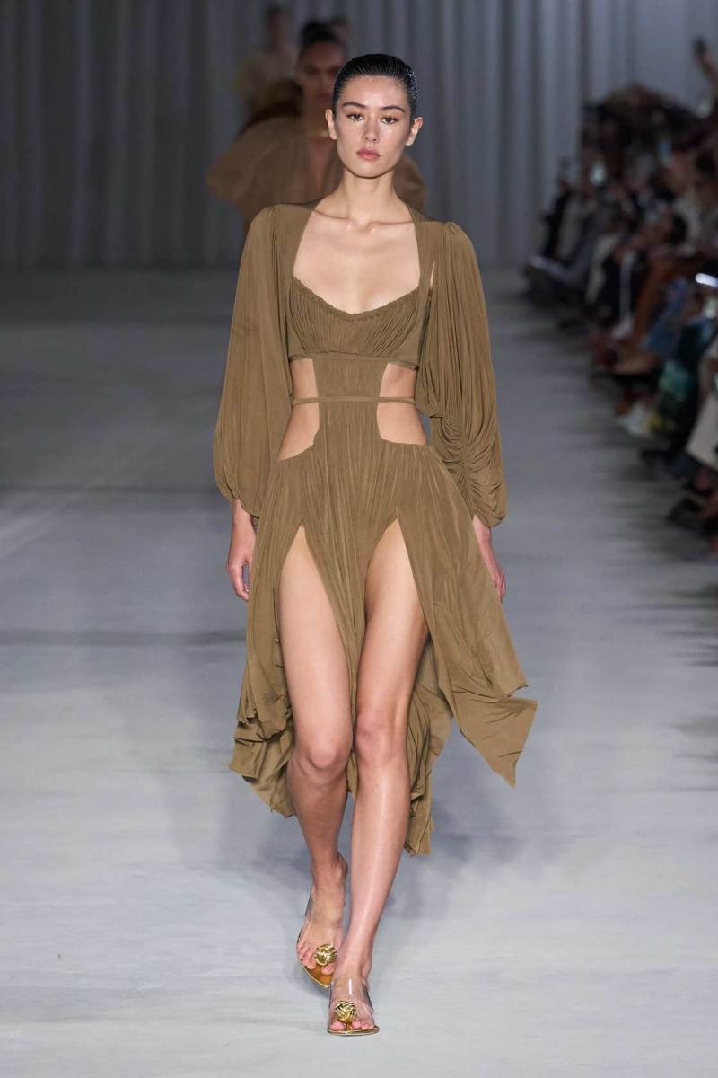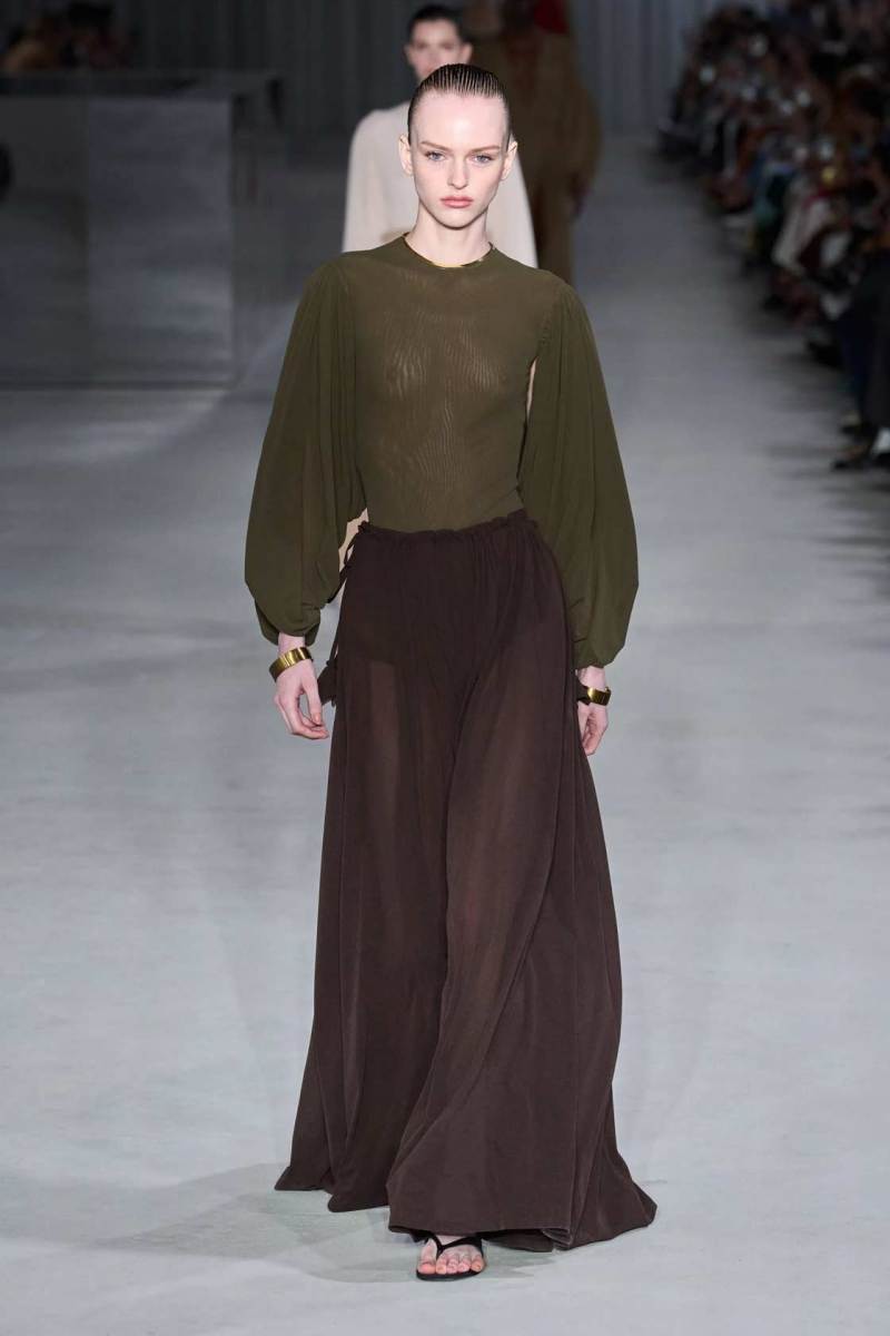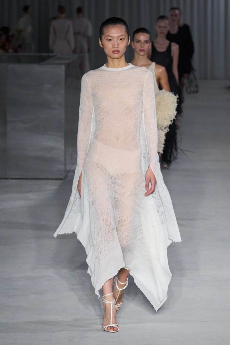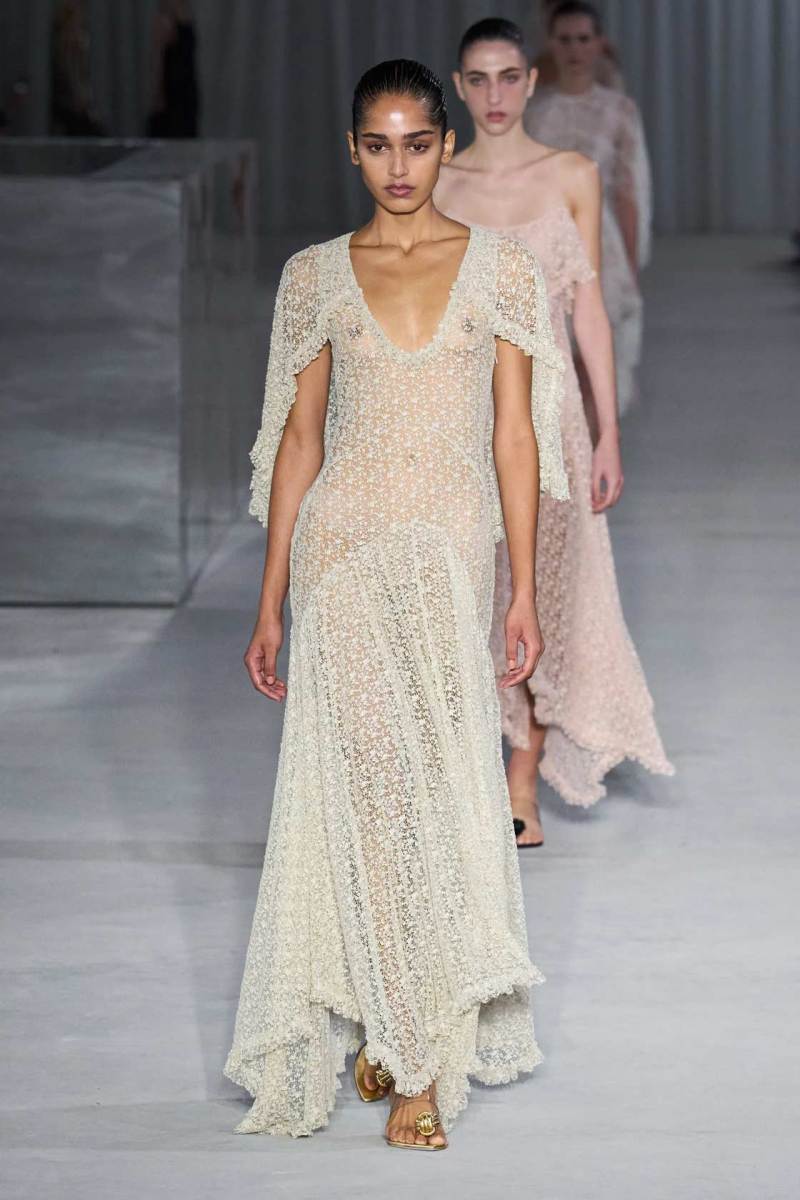 Troviamo trasparenze, pizzi, maniche a sbuffo, blazer dalla chiusura irregolare ma anche accessori di tendenza come tote a rete e grandi pouch scamosciate con lunghe frange. Gli elementi chiave per la PE25 di Lorenzo Serafini sono decisamente attuali e affascinano un pubblico dal gusto irresistibilmente minimal e all’insegna del comfort.