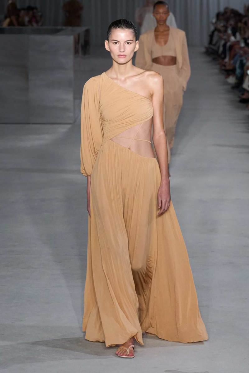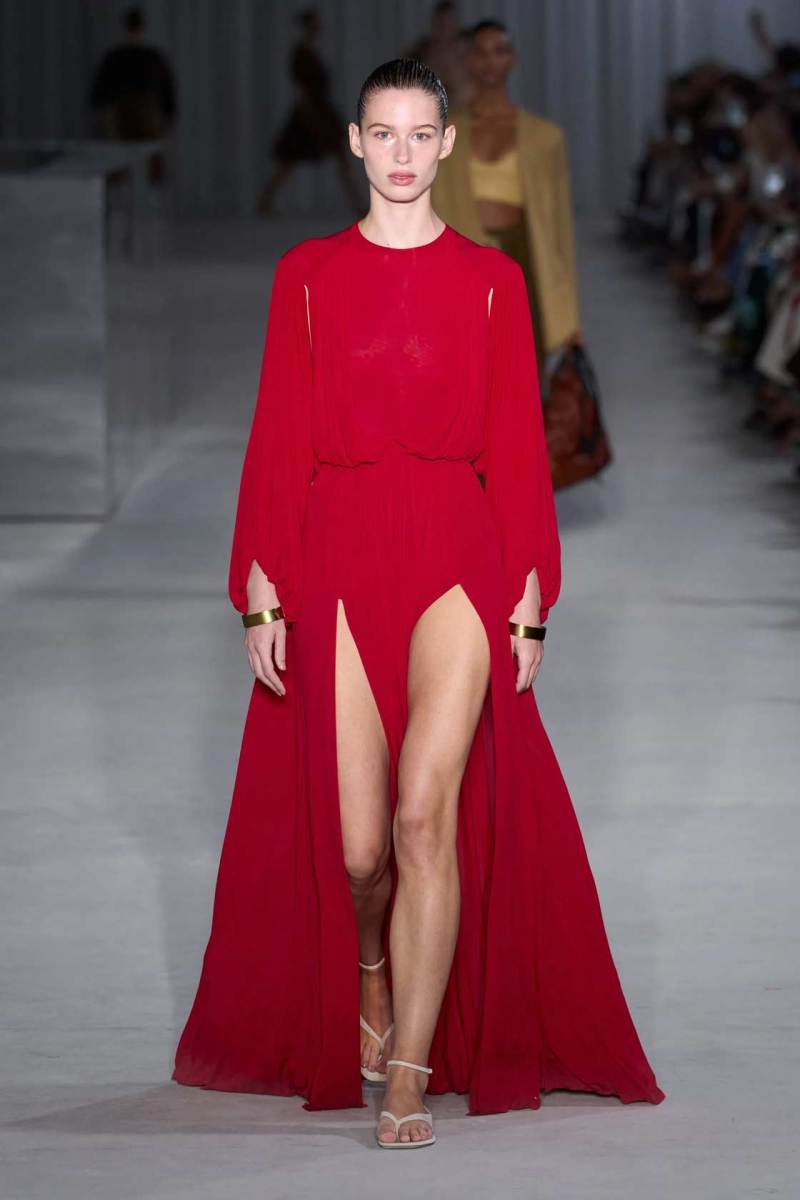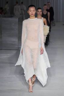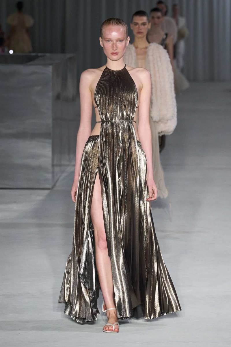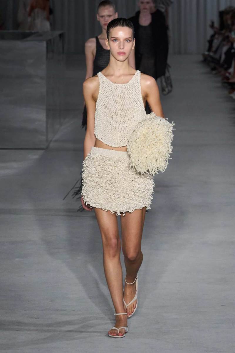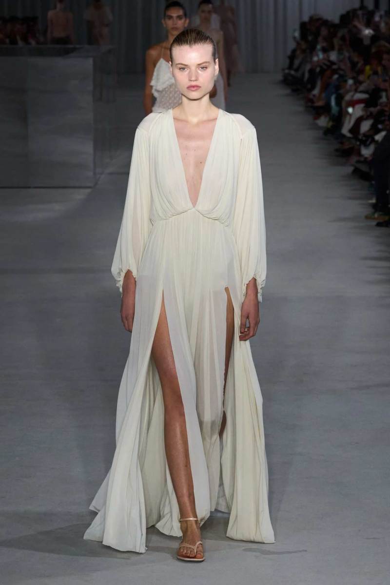 Troviamo trasparenze, pizzi, maniche a sbuffo, blazer dalla chiusura irregolare ma anche accessori di tendenza come tote a rete e grandi pouch scamosciate con lunghe frange. Gli elementi chiave per la PE25 di Lorenzo Serafini sono decisamente attuali e affascinano un pubblico dal gusto irresistibilmente minimal e all’insegna del comfort.