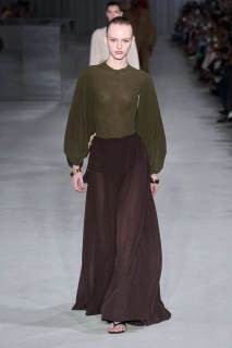 Si presentano abiti perfettamente in tendenza, i colori si mantengono su una palette essenziale dal bianco al color mattone, fino ad arrivare a un marrone testa moro deciso; i volumi sono leggeri, raffinati e semplici da indossare all’interno di in un immaginario comune.