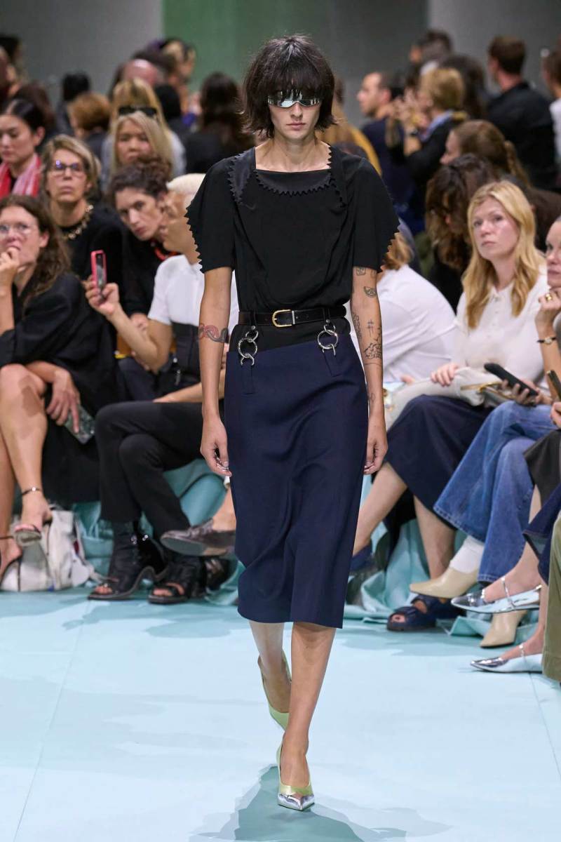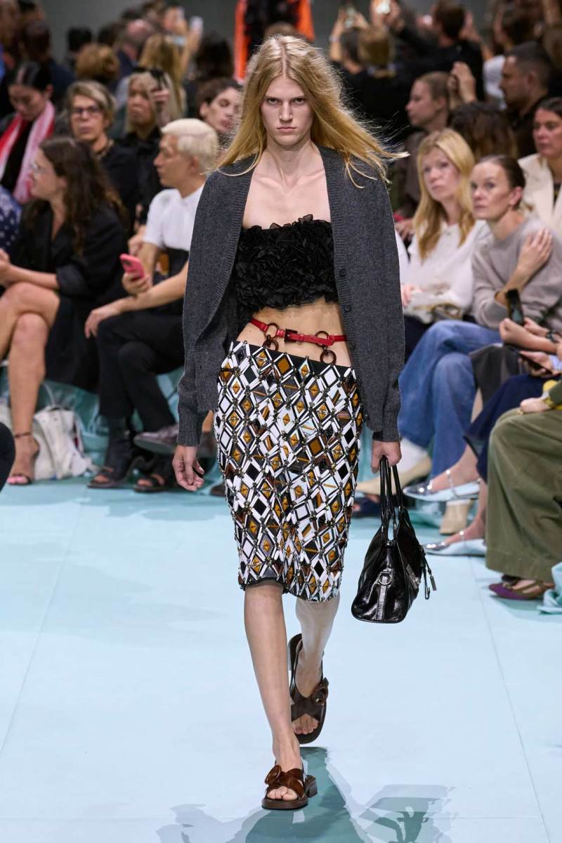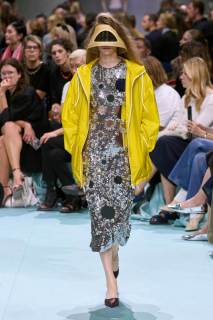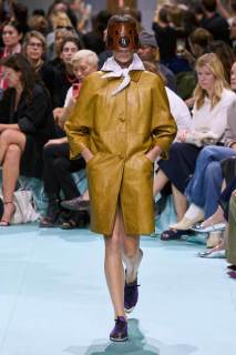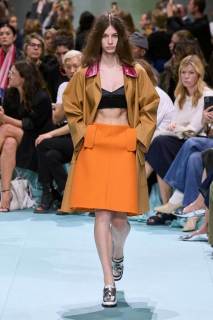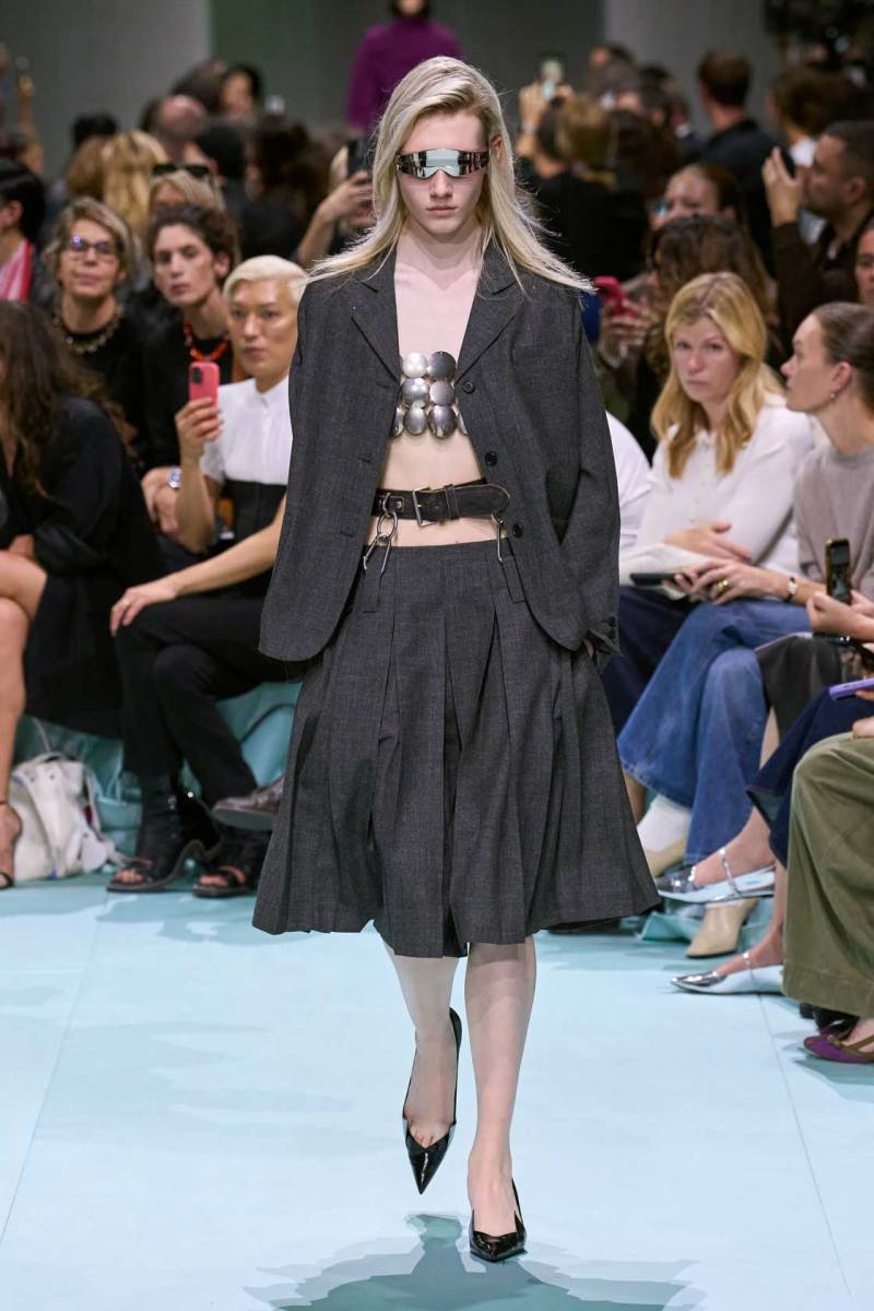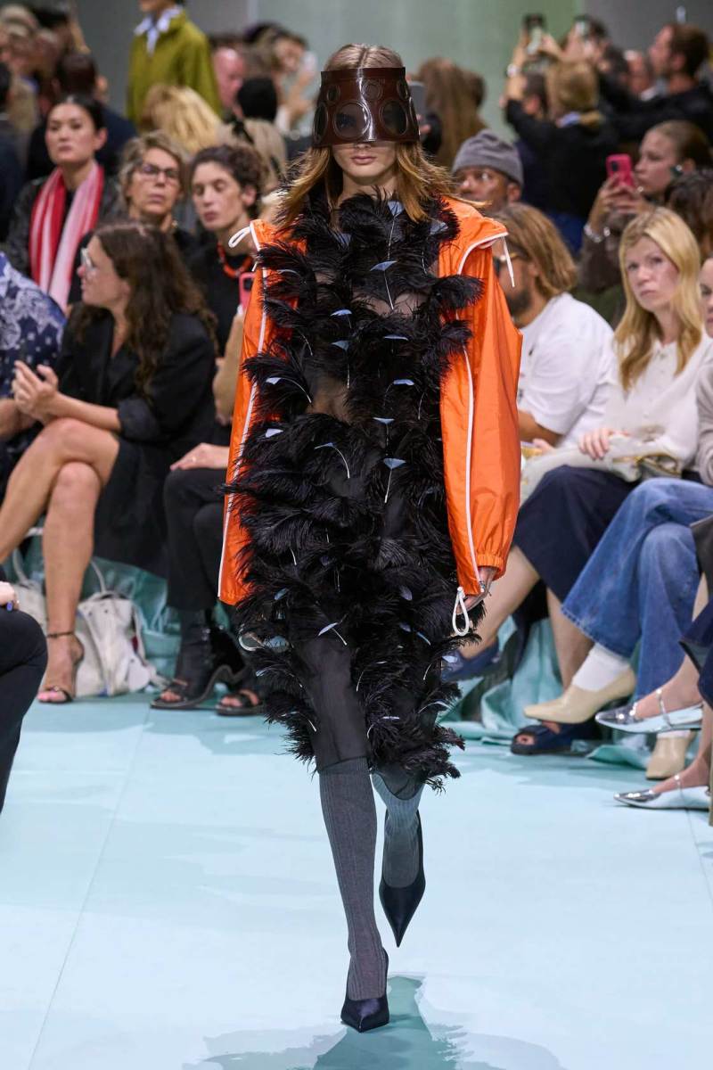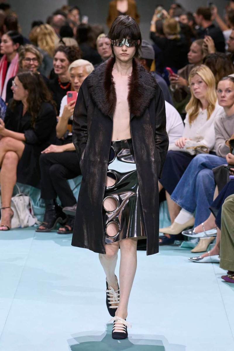 Il primo look verte su un vestito corto bianco, dalle spalline sottili (legate a mo’ di fiocco) con una fantasia sottile a trama gialla ed arancione. Il secondo outfit, invece, viene presentato con un’attitude decisamente diversa: la modella sfila con un vestito di pelle realizzato con anelli in metallo disposti su tutta la sua lunghezza. Gonne metallizzate, giacche oversize, maschere controverse per il viso e perfino scarpe dalle molteplici punte, sono solo alcuni dei dettagli particolari che vengono offerti dalla prospettiva di Prada. Sembra che il tema dark e quello metal si siano fusi insieme per una primavera decisamente avanguardista.
