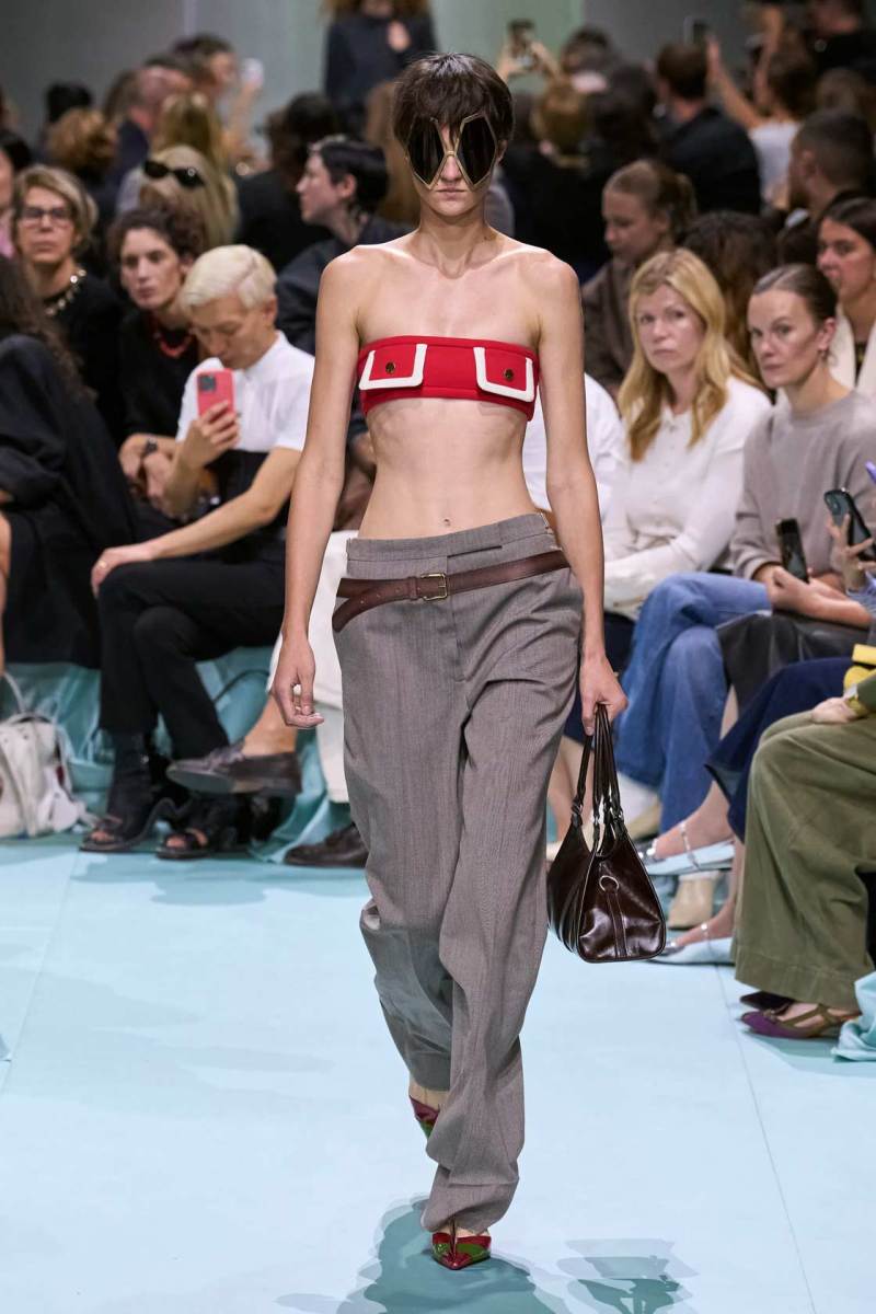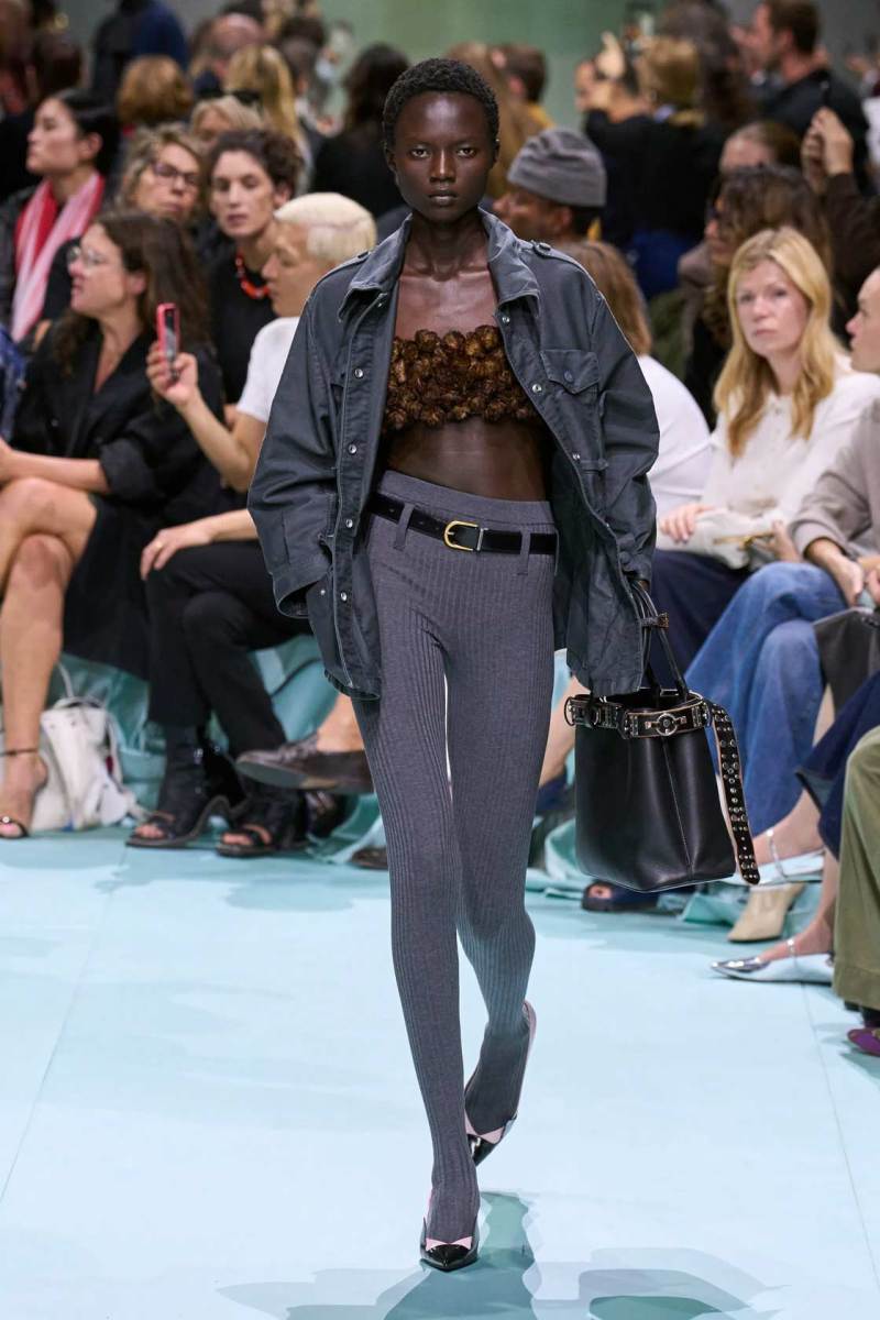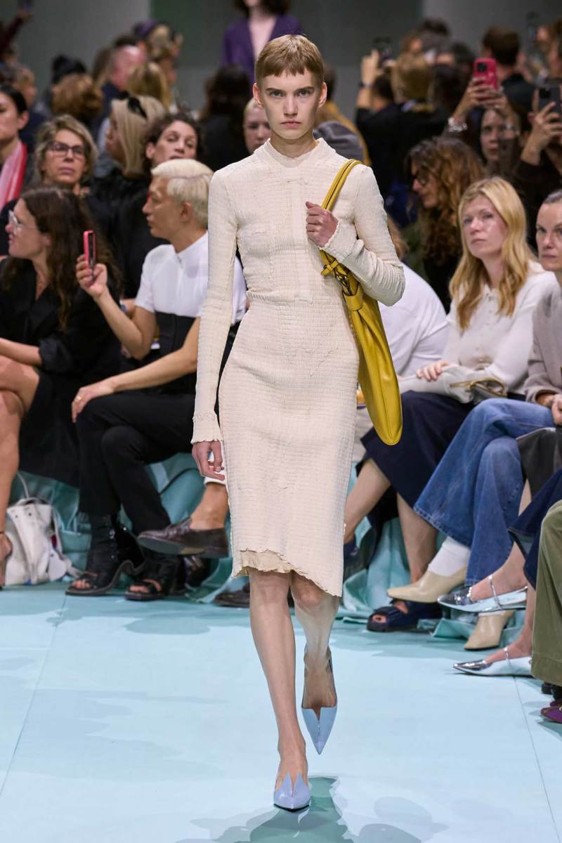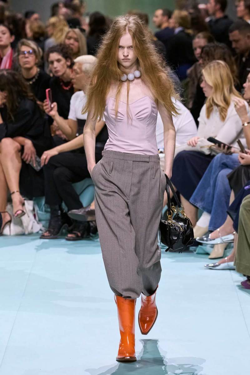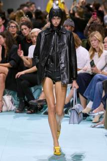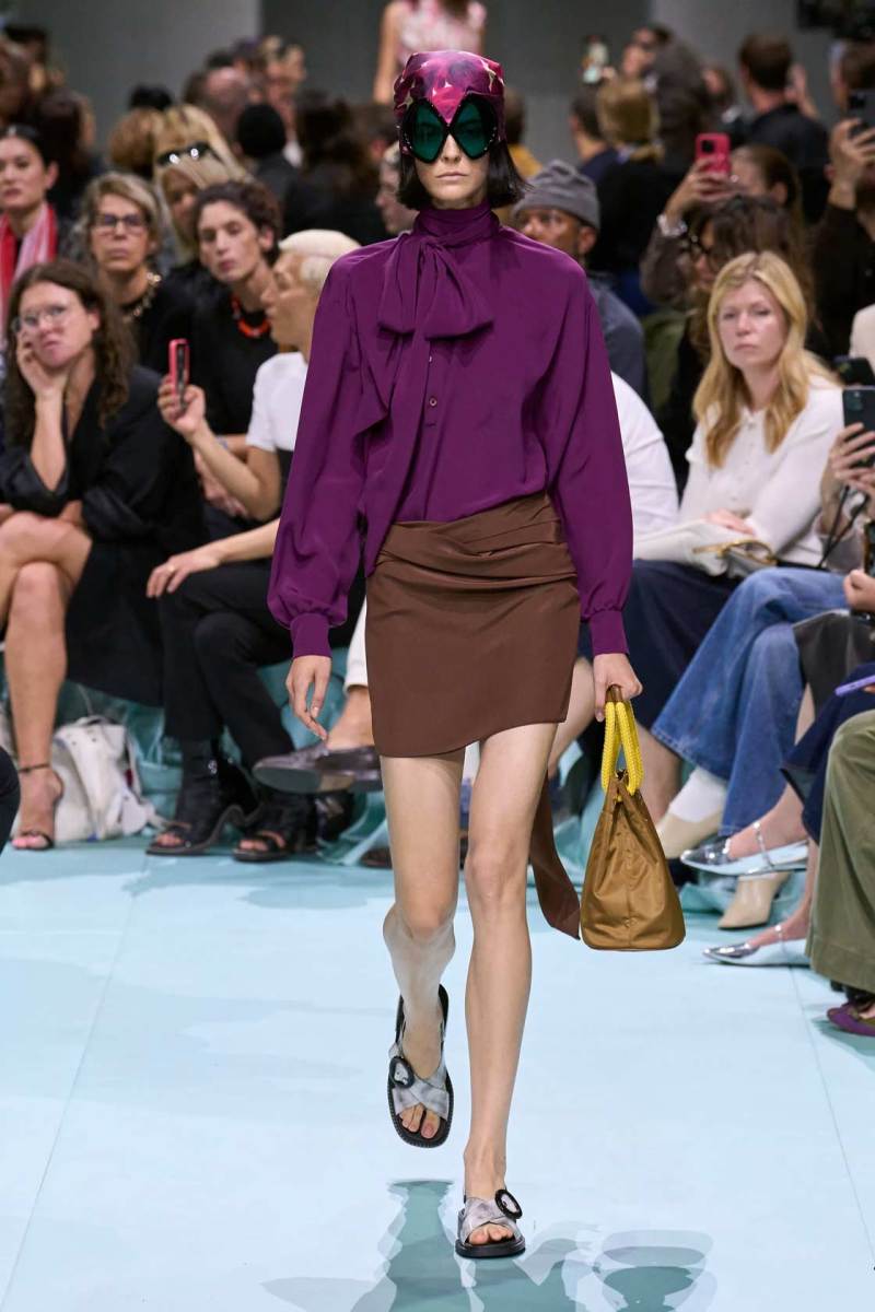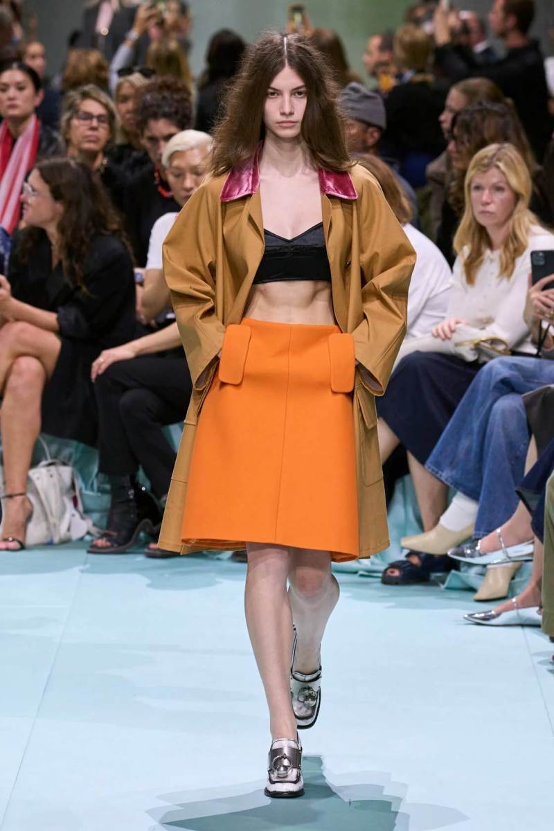 Il primo look verte su un vestito corto bianco, dalle spalline sottili (legate a mo’ di fiocco) con una fantasia sottile a trama gialla ed arancione. Il secondo outfit, invece, viene presentato con un’attitude decisamente diversa: la modella sfila con un vestito di pelle realizzato con anelli in metallo disposti su tutta la sua lunghezza. Gonne metallizzate, giacche oversize, maschere controverse per il viso e perfino scarpe dalle molteplici punte, sono solo alcuni dei dettagli particolari che vengono offerti dalla prospettiva di Prada. Sembra che il tema dark e quello metal si siano fusi insieme per una primavera decisamente avanguardista.