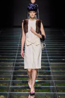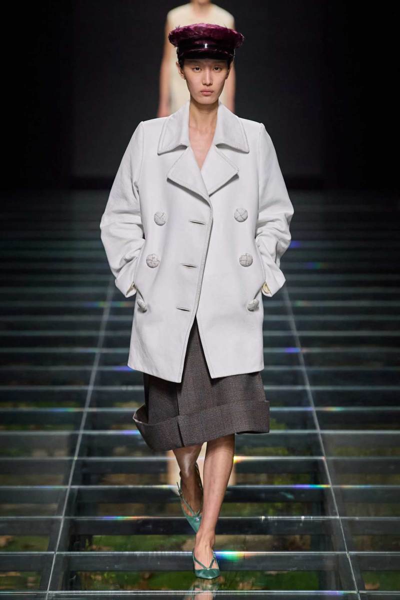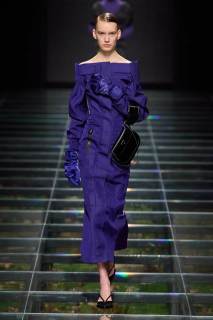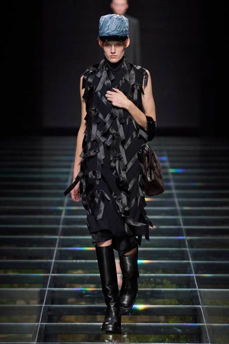 Le gonne asimmetriche, le ruches e soprattutto i fiocchi, emergono come punti focali della sfilata, conferendo ai look un’espressione di femminilità e un’aura di individualità. I cappelli, ispirati alle divise militari e impreziositi da piume e colori scintillanti, donano un tocco di mistero e suggestione, suggerendo un mix unico di forza femminile e delicatezza.