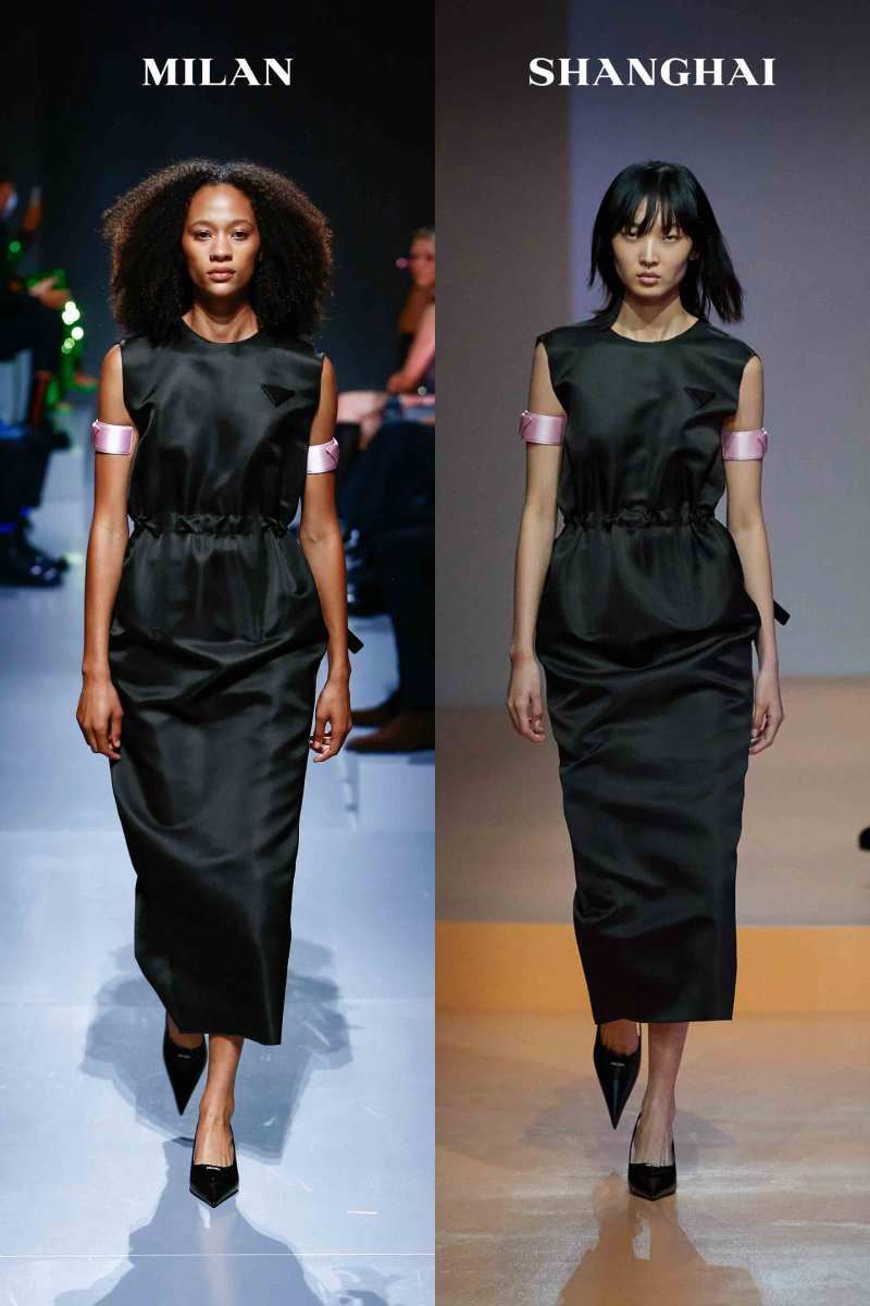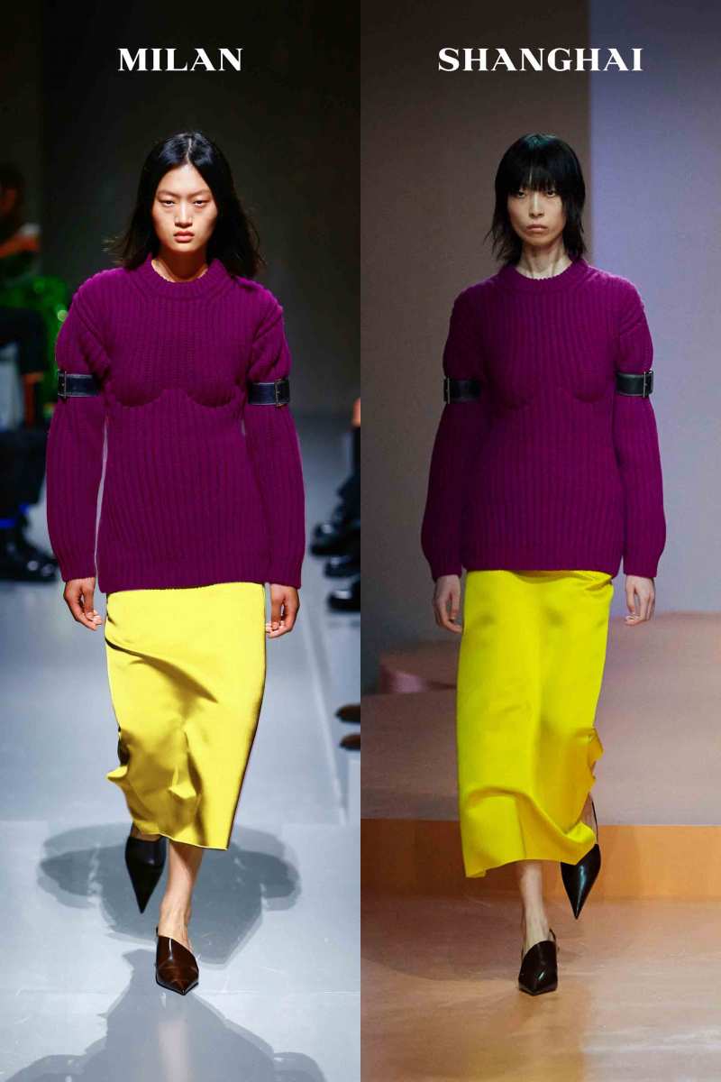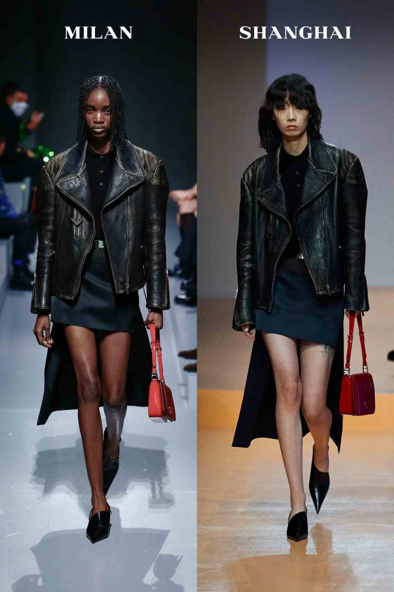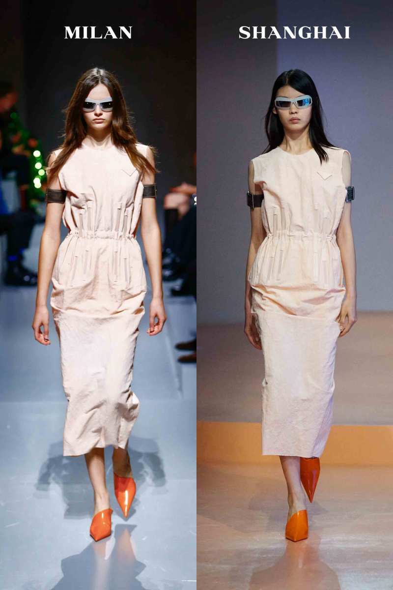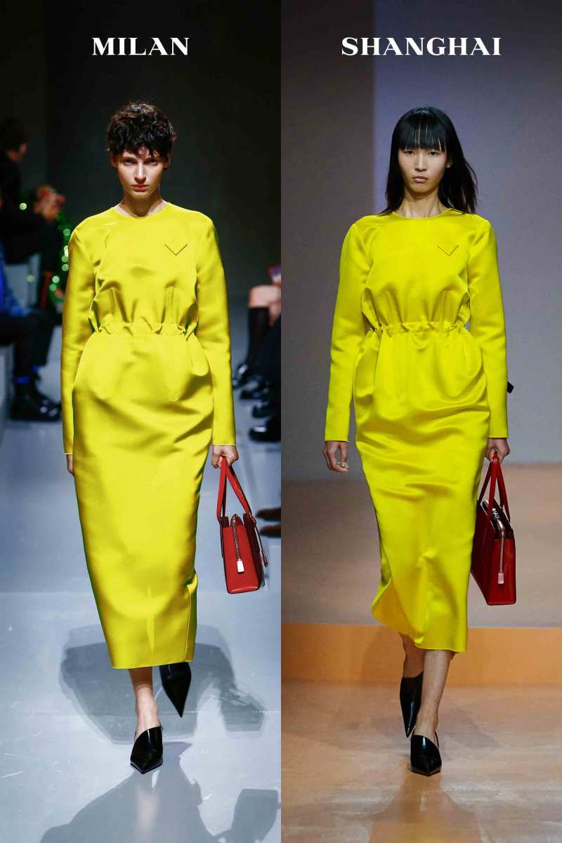 Una sintesi tra passato e presente, il presente che non è più tale dal momento stesso in cui si vive, sfila in contemporanea su due passerelle separate, quella del Deposito della Fondazione Prada a Milano e nel Bund 1 di Shanghai. Schermi video faranno dialogare le due sfilate l’una con l’altra, unendo realtà fisiche e virtuali in spazi allestiti in modo analogo.