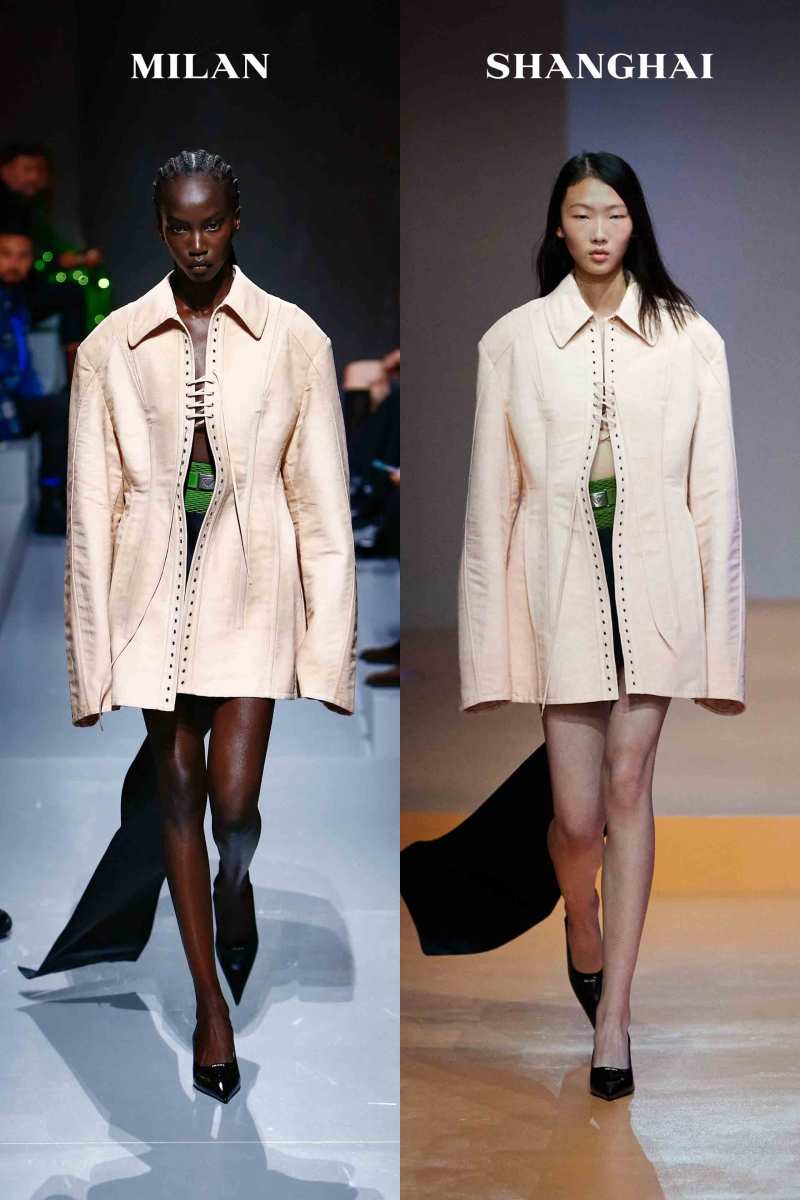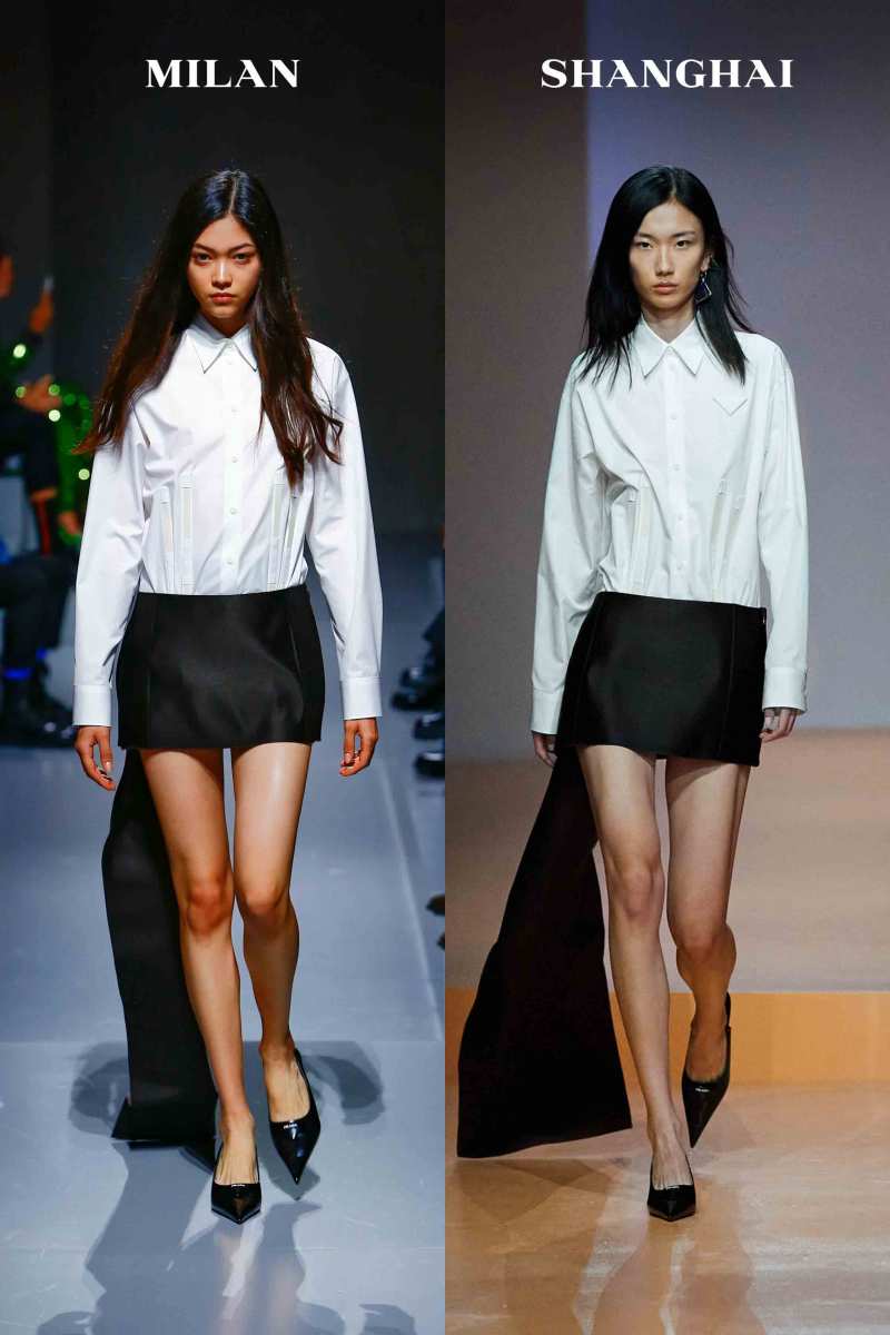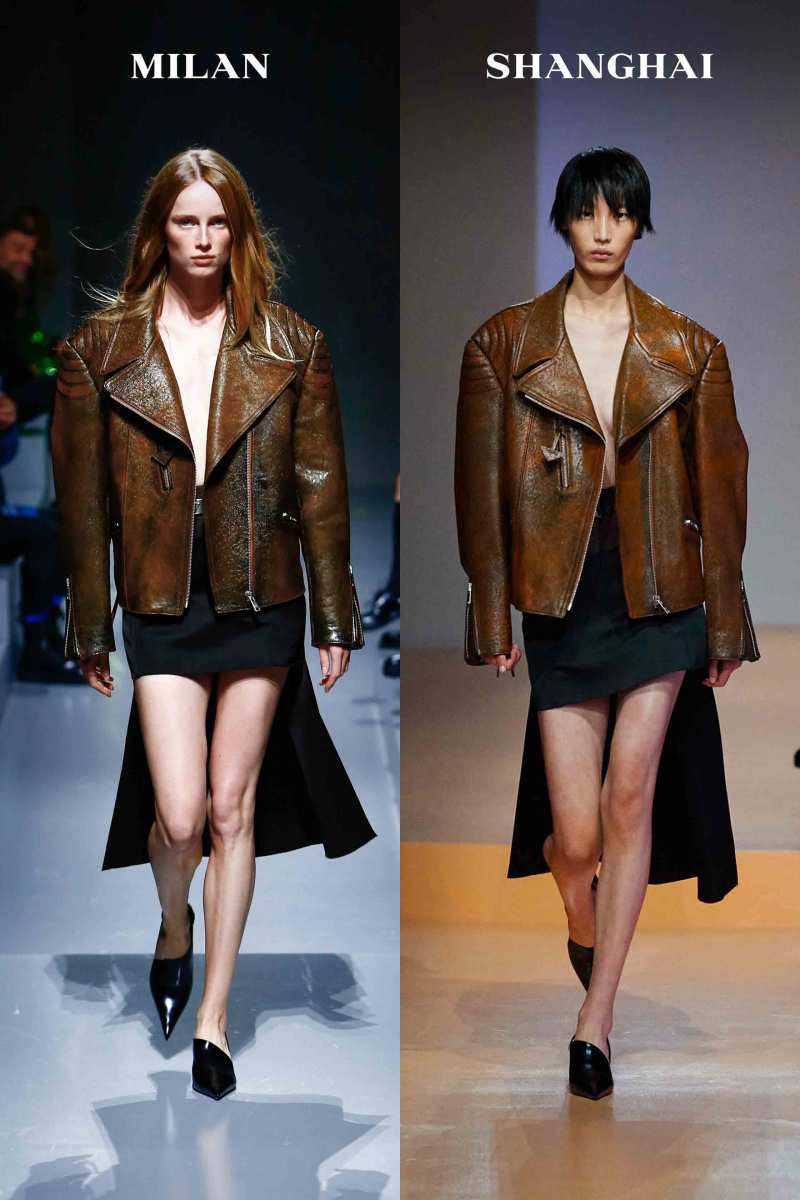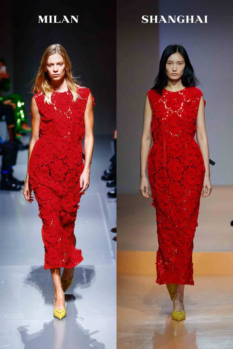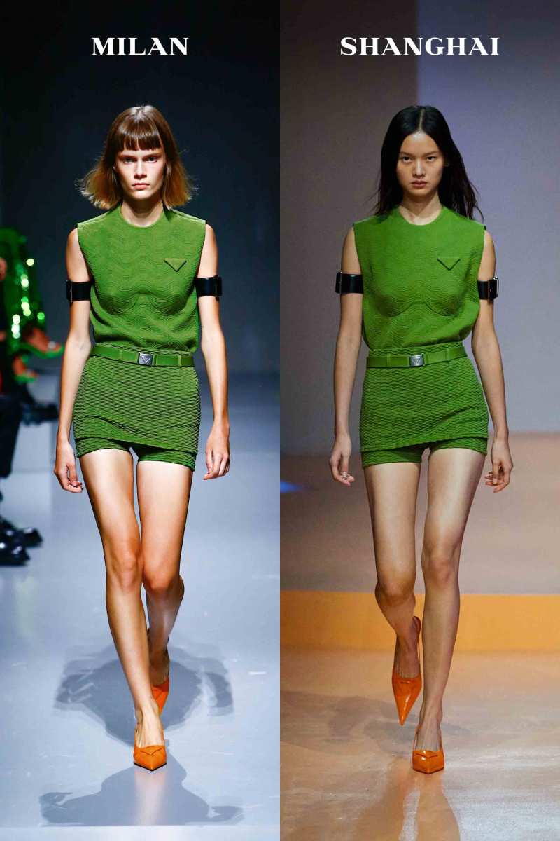 Una sintesi tra passato e presente, il presente che non è più tale dal momento stesso in cui si vive, sfila in contemporanea su due passerelle separate, quella del Deposito della Fondazione Prada a Milano e nel Bund 1 di Shanghai. Schermi video faranno dialogare le due sfilate l’una con l’altra, unendo realtà fisiche e virtuali in spazi allestiti in modo analogo.
