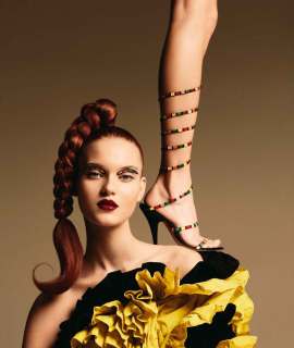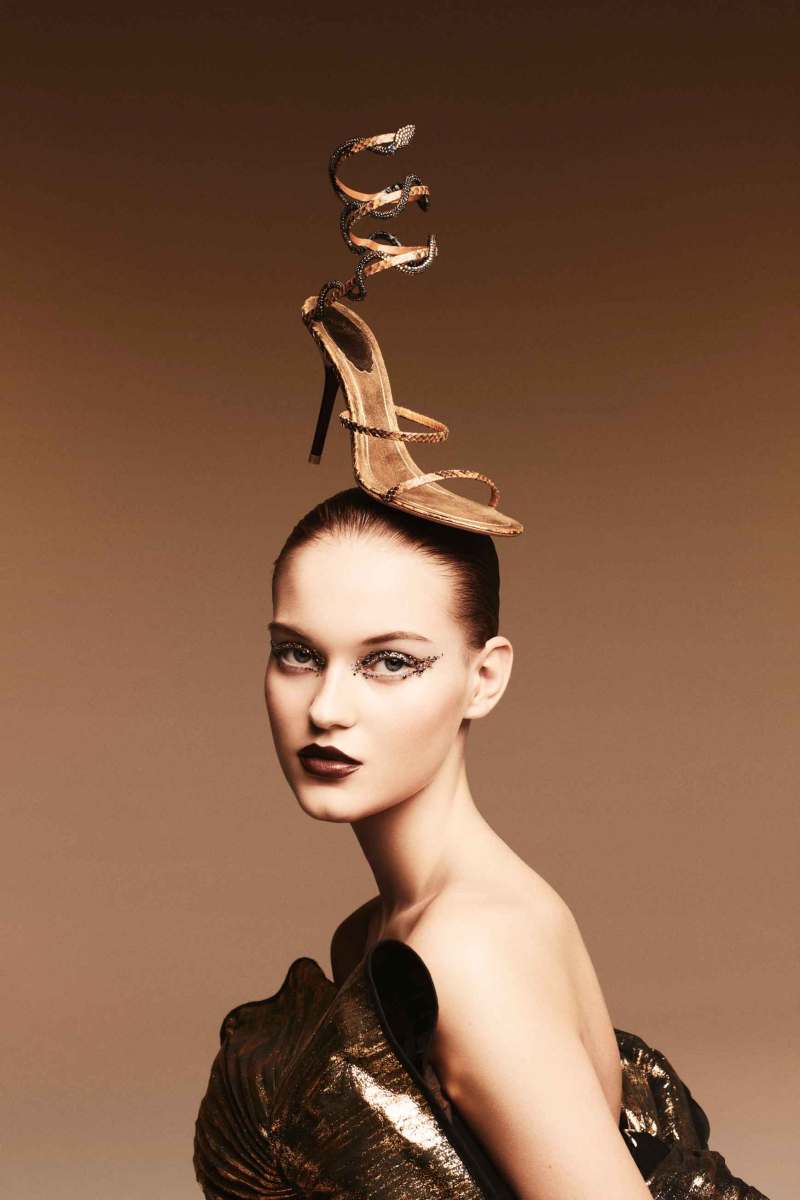Da sempre, René Caovilla disegna scarpe gioiello che sono sinonimo e risultato di un lavoro artistico minuzioso che miscela perfettamente arte ed eccellenza creativa e progettuale. Il modello “Cleo” rappresenta l’essenza della personalità della Maison, nonché i vari canoni estetici e i simboli cardine ripresi nelle varie creazioni: il motivo a serpente che avvolge elegantemente la caviglia e le decorazioni sontuose applicate a mano.