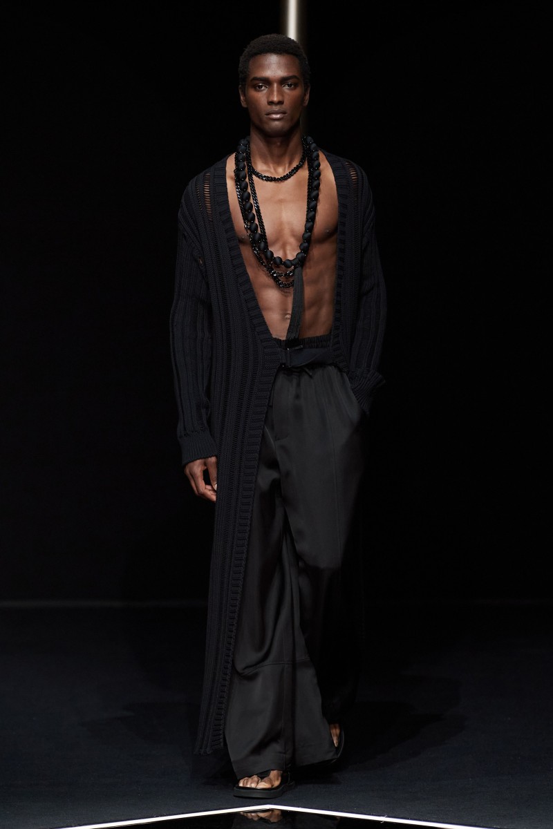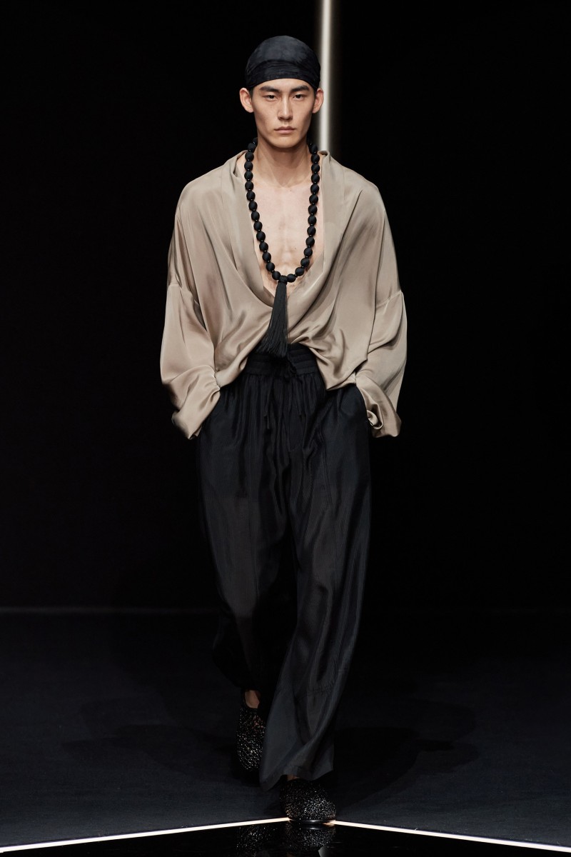 Atmosfere notturne sulla passerella nera segnata da due quadrati di luce illuminavano i fluttuanti tessuti scelti per questa collezione da Le mille e una notte, trascorse più precisamente nel deserto. Perché solo il color sabbia ha interrotto una sfilza di primi look total black di completi un pezzo e mezzo, indossati a nudo con una cravatta-sciarpa con frange. Tessuti jacquard regalano giochi di luce, maglie traforate a grossi quadri, ricami tono su tono percettibili quasi solo al tatto e foglie ginkgo dipinte a mano sono gli accenti posti su questa nuova ricerca minimalista. Unici massimalismi concessi, l’ampiezza del pantalone, maxibag, le lunghe collane dal gusto indiano e i ricami luminosi dei look finali.
