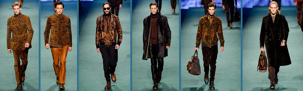 Kean Etro, da sempre attento alla ricerca di stampe e tessuti particolari, propone in passerella morbidi velluti lisci o a coste orizzontali, decorati tono su tono da abili pittori che li rendono così capi unici ed estremamente pregiati.