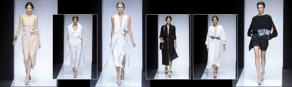 Abiti lunghi, tute intere e look da cocktail per una passerella austera che fa della cintura la sua coperta di linus e dei giochi di sovrapposizioni il suo fil rouge prendendo ispirazione dalla top model Gia Carangi miscelata con le immagini delle campagne pubblicitarie scattate dal fotografo Herb Ritts.