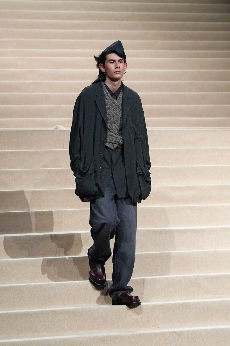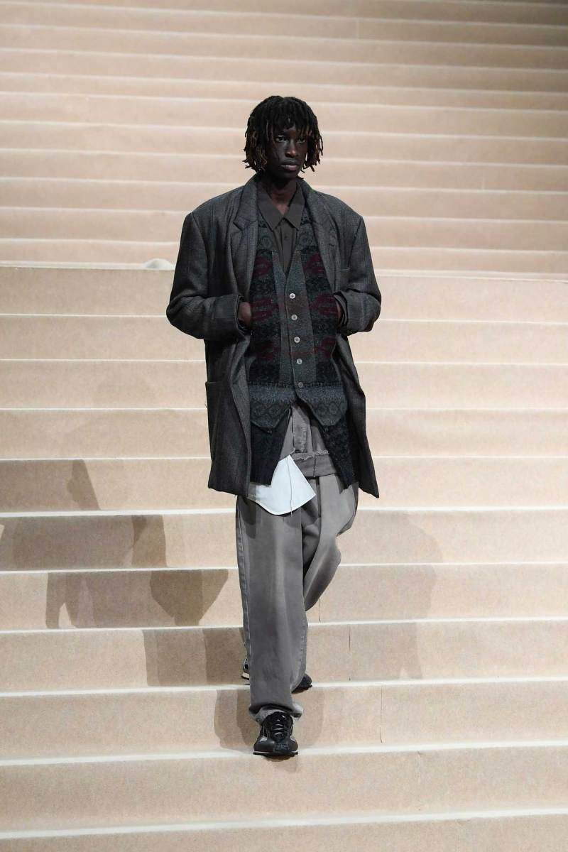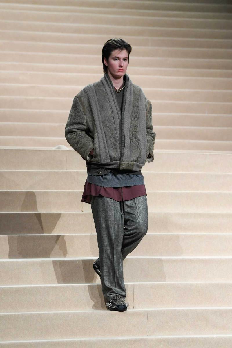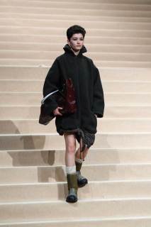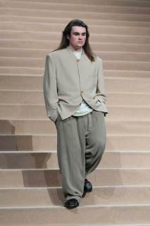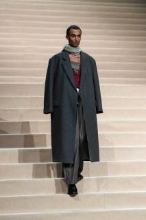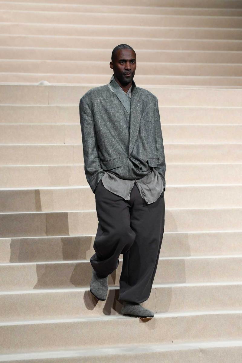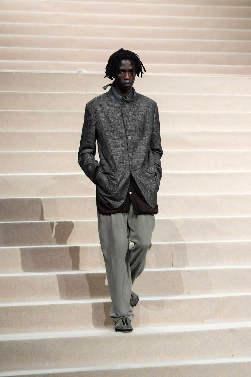 Una sfilata emozionante, a tratti drammatica. Al termine, l’essenza del “rising”: i modelli camminano in salita sulla scalinata dando le spalle agli spettatori, con un’aria di riflessione faticosa.