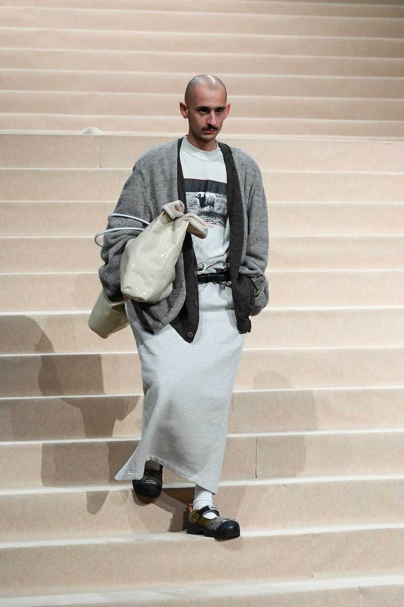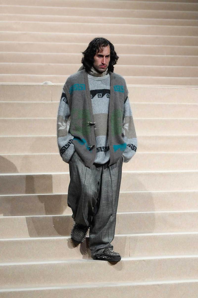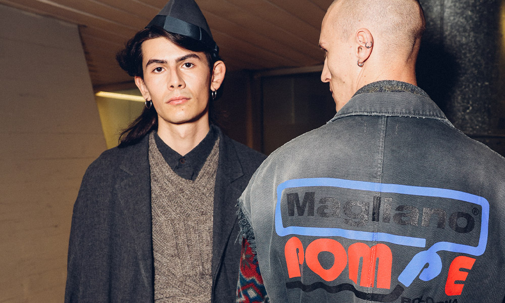 Quest’anno Luca Magliano festeggia i 5 anni dal suo debutto al Pitti. Per il designer tornare qui è un piacere, si sente a casa, è un modo di ritrovare le persone a cui vuole bene. In passerella sfilano binder, giacche di cotone stropicciate e sbarazzine, maglioni originali.