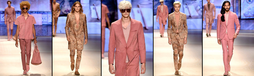 I materiali tradizionalmente usati per la collezione donna vengono ripresi per quella maschile realizzando camicie in morbido leggero e trasparenze chiffon, decorate con fili metallici. Le stampe hanno un sapore antico ma mai scontato con uno sguardo volto al futuro. Alla canonica stampa che ha reso nota la linea Etro si aggiungono fantasie tribali. Un look all’insegna di una pacata sensualità basata sul vedo-non-vedo. Giacche in suede abbracciano il corpo con un effetto seconda pelle accompagnate da camicie essenziali in tessuto jacquard. Tra gli accessori spiccato i backpacks tenuti a mano e le slip-on traforate.