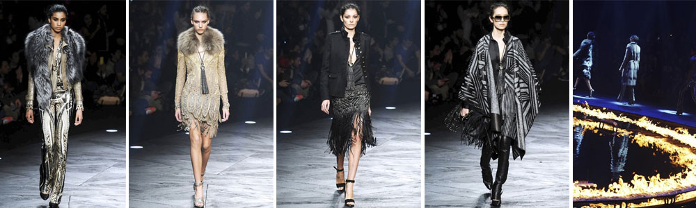 Hippy e un po’ bohémien, questa la cifra stilistica di Roberto Cavalli, in evidenza su gonne a stampa animalier, giacche con piume di fagiano e piccole stripes di pelliccia che accompagnano abiti aquilone.