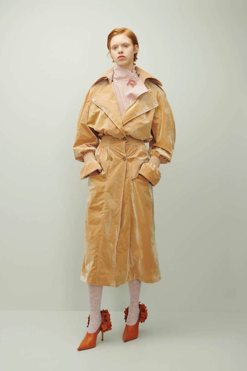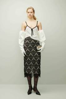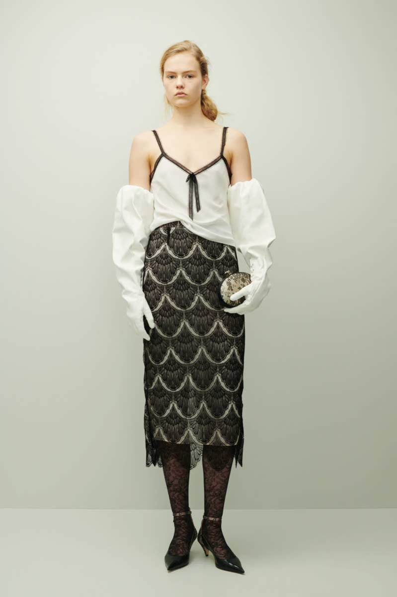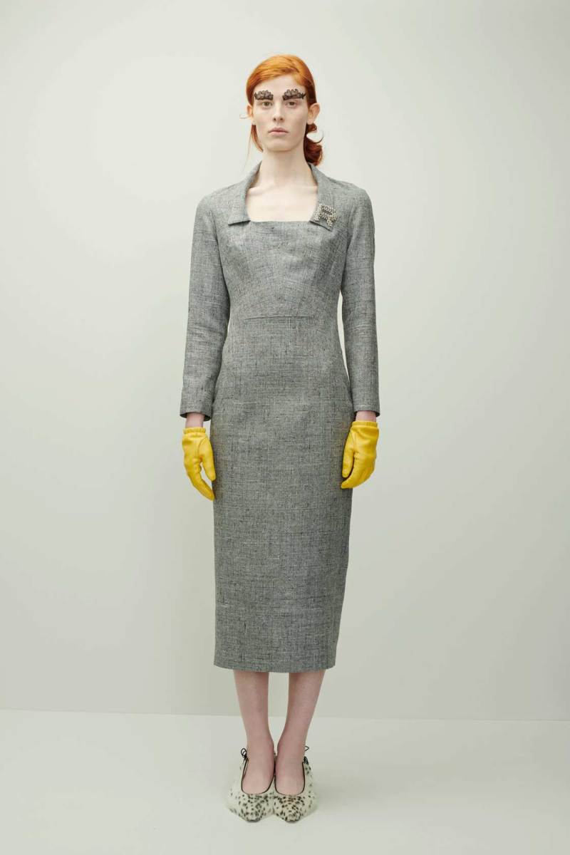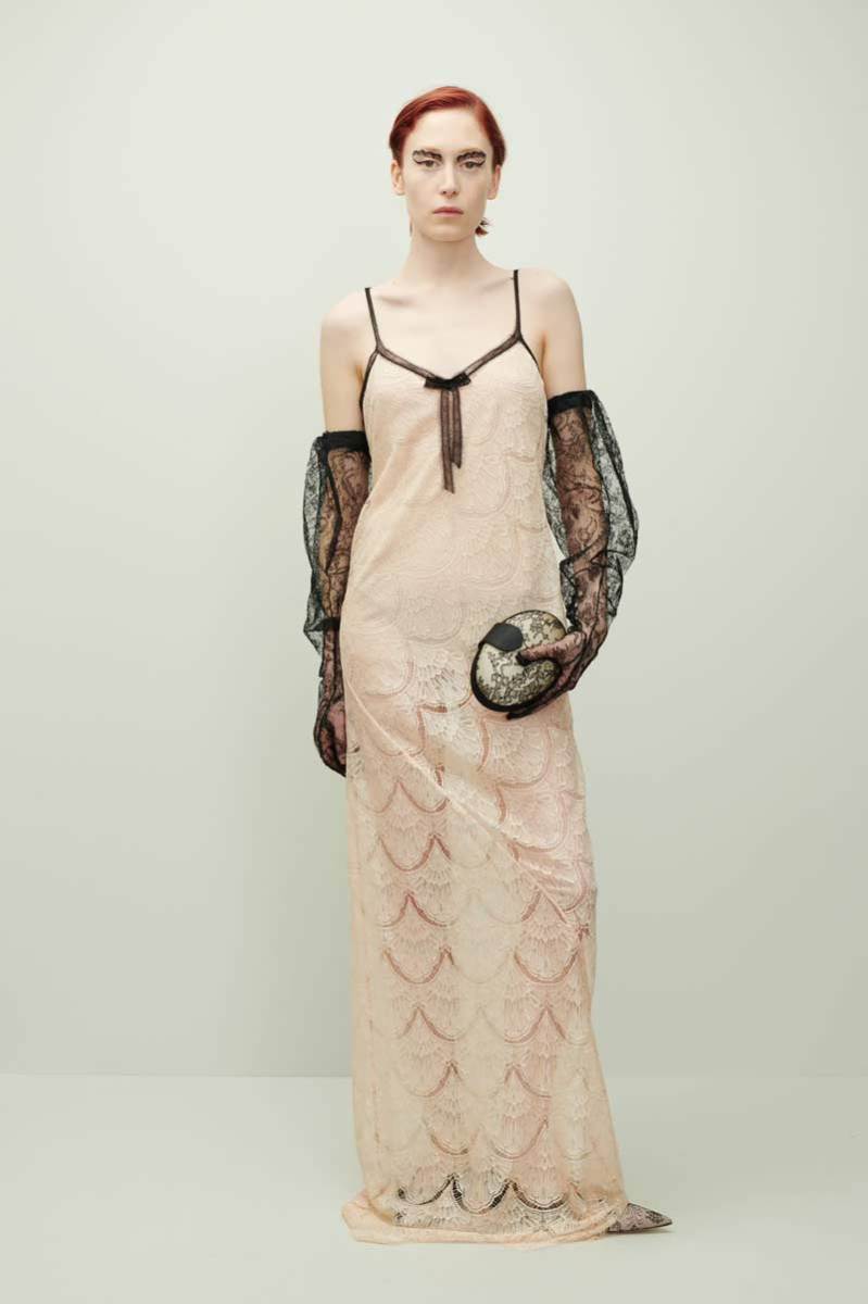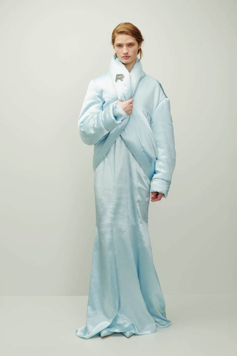 Vengono mostrati look composti da overcoat in lana jacquard a righe, abiti in satin anni ’20, tailleur con tasche in pelliccia, piumini in raso, cappotti cocoon, giacche in flanella dal taglio maschile, e poi ancora bomber e gonne ricamate con elementi in PVC. Come accessori, calze autoreggenti rigorosamente in pizzo, décolleté di vario genere e guanti molto glamour. Il pizzo è protagonista assoluto, così come i corsetti.