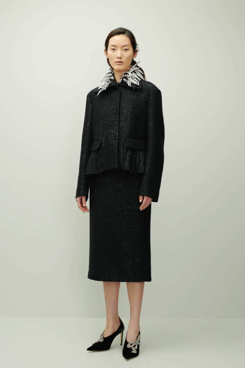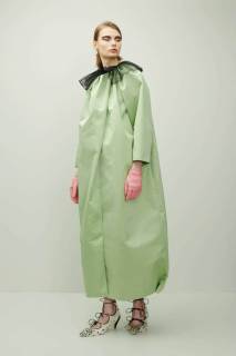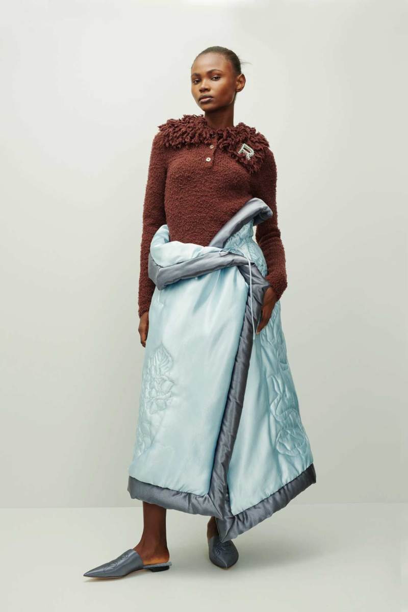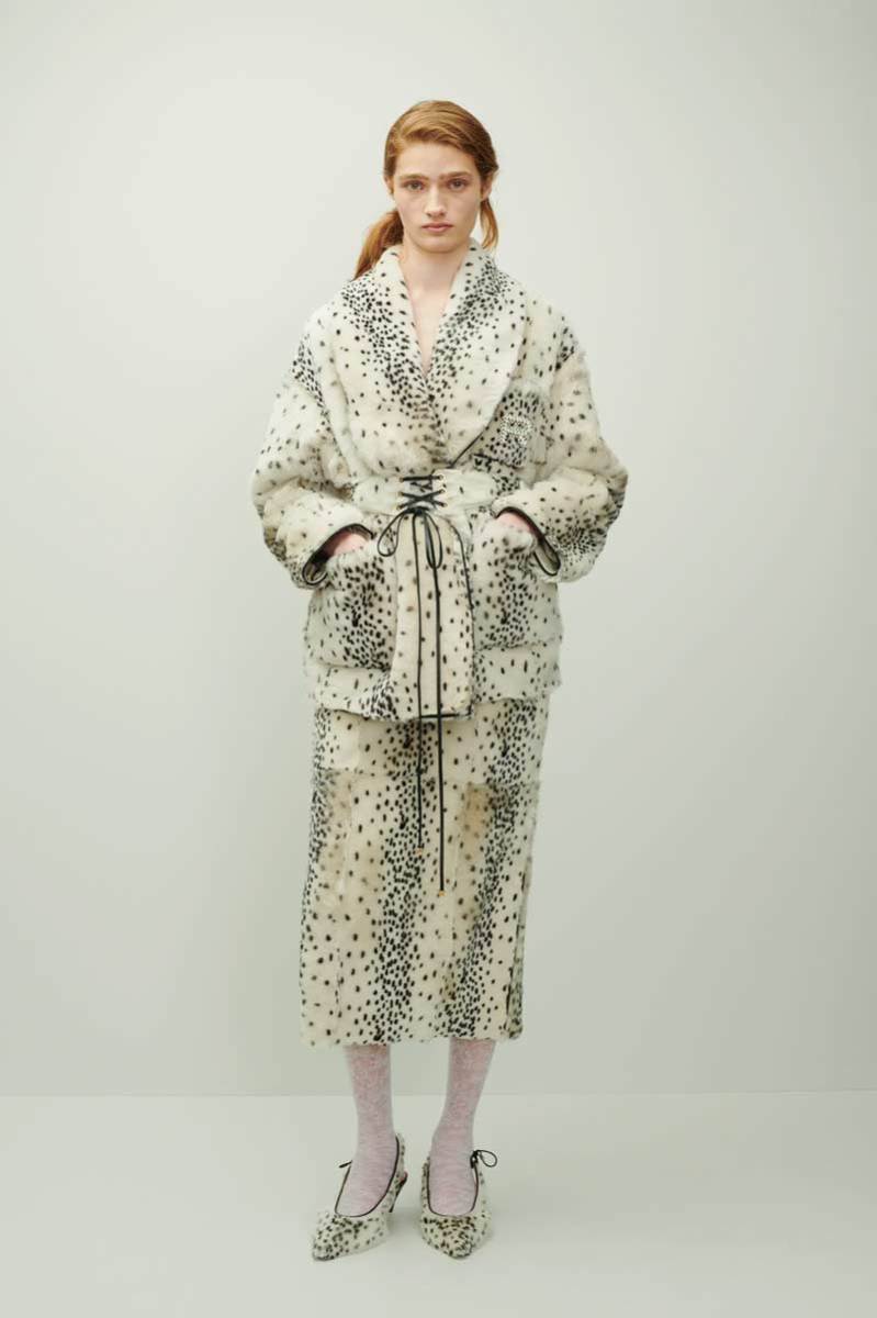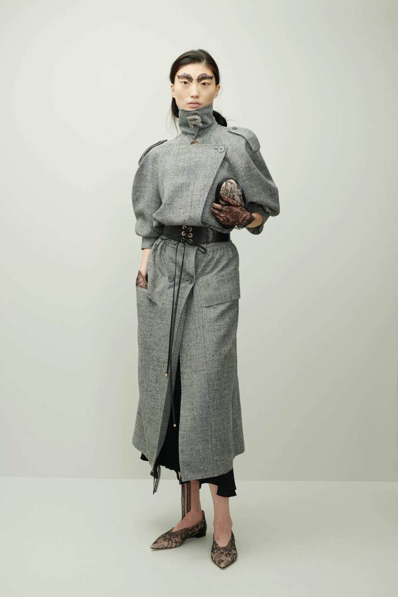 Vengono mostrati look composti da overcoat in lana jacquard a righe, abiti in satin anni ’20, tailleur con tasche in pelliccia, piumini in raso, cappotti cocoon, giacche in flanella dal taglio maschile, e poi ancora bomber e gonne ricamate con elementi in PVC. Come accessori, calze autoreggenti rigorosamente in pizzo, décolleté di vario genere e guanti molto glamour. Il pizzo è protagonista assoluto, così come i corsetti.