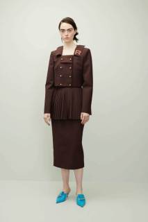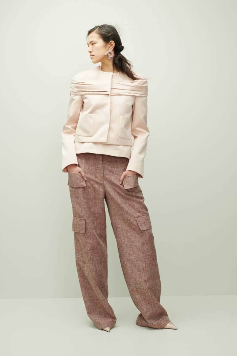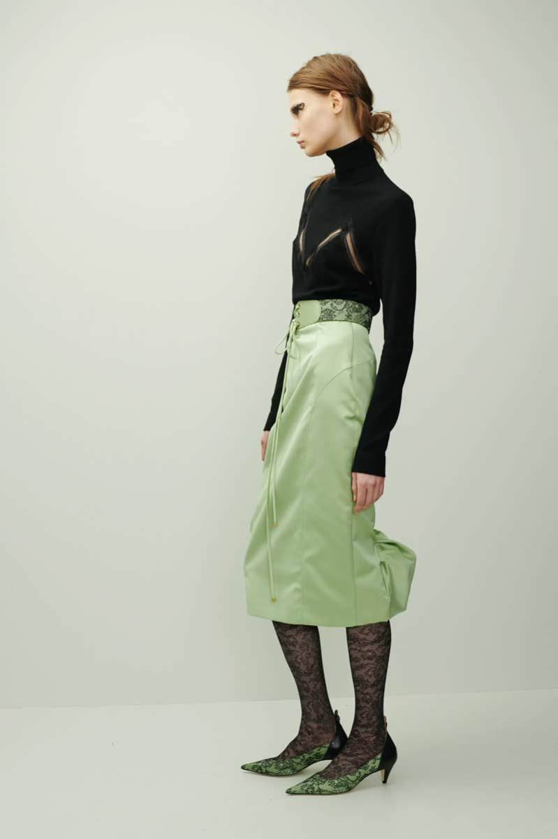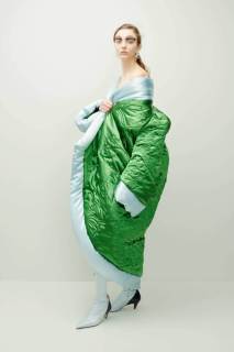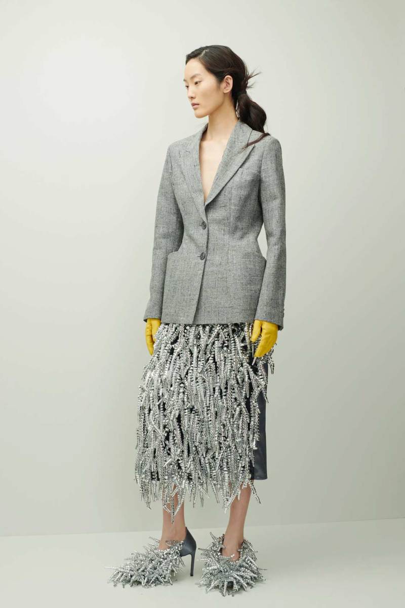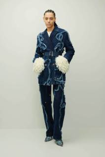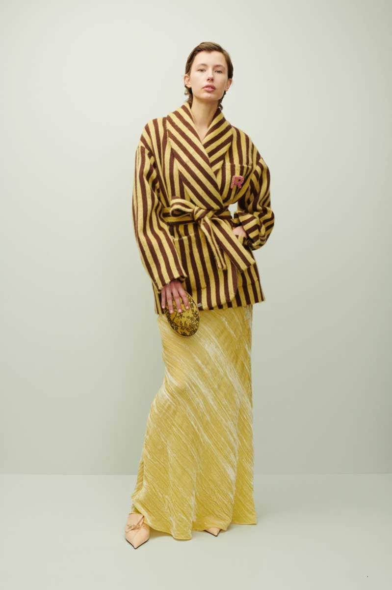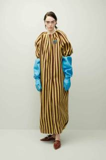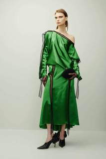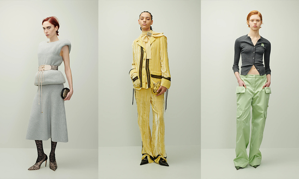 Vengono mostrati look composti da overcoat in lana jacquard a righe, abiti in satin anni ’20, tailleur con tasche in pelliccia, piumini in raso, cappotti cocoon, giacche in flanella dal taglio maschile, e poi ancora bomber e gonne ricamate con elementi in PVC. Come accessori, calze autoreggenti rigorosamente in pizzo, décolleté di vario genere e guanti molto glamour. Il pizzo è protagonista assoluto, così come i corsetti.