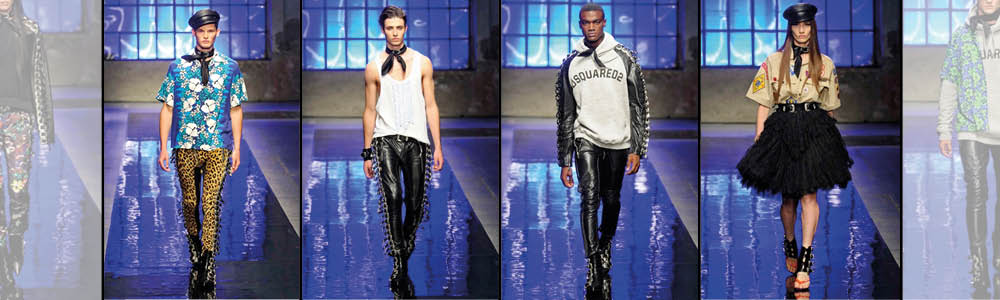 L’uomo firmato DSquared2 è grintoso e divertente. Tuttavia non mancano proposte più eleganti, che si concentrano nella parte finale dello show e prevedono abiti sartoriali dai colori chiari come il rosa quarzo, l’azzurro acquamarina e il bianco, ma anche audaci accostamenti di blazer, papillon e jeans macchiati.