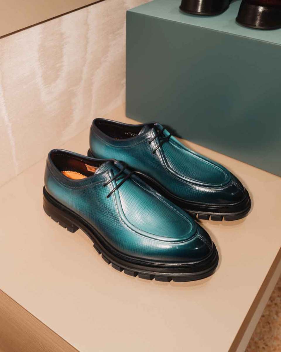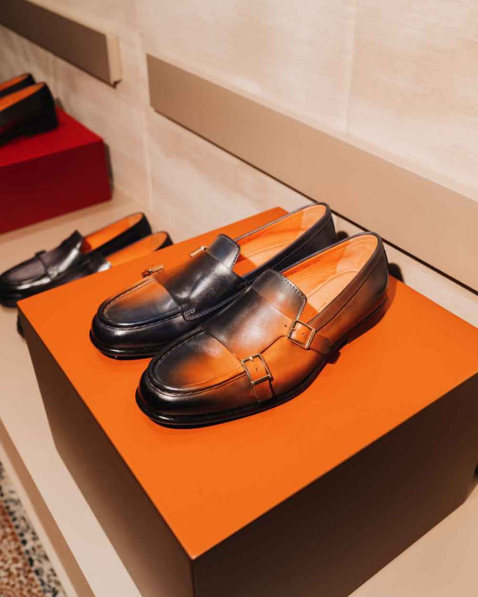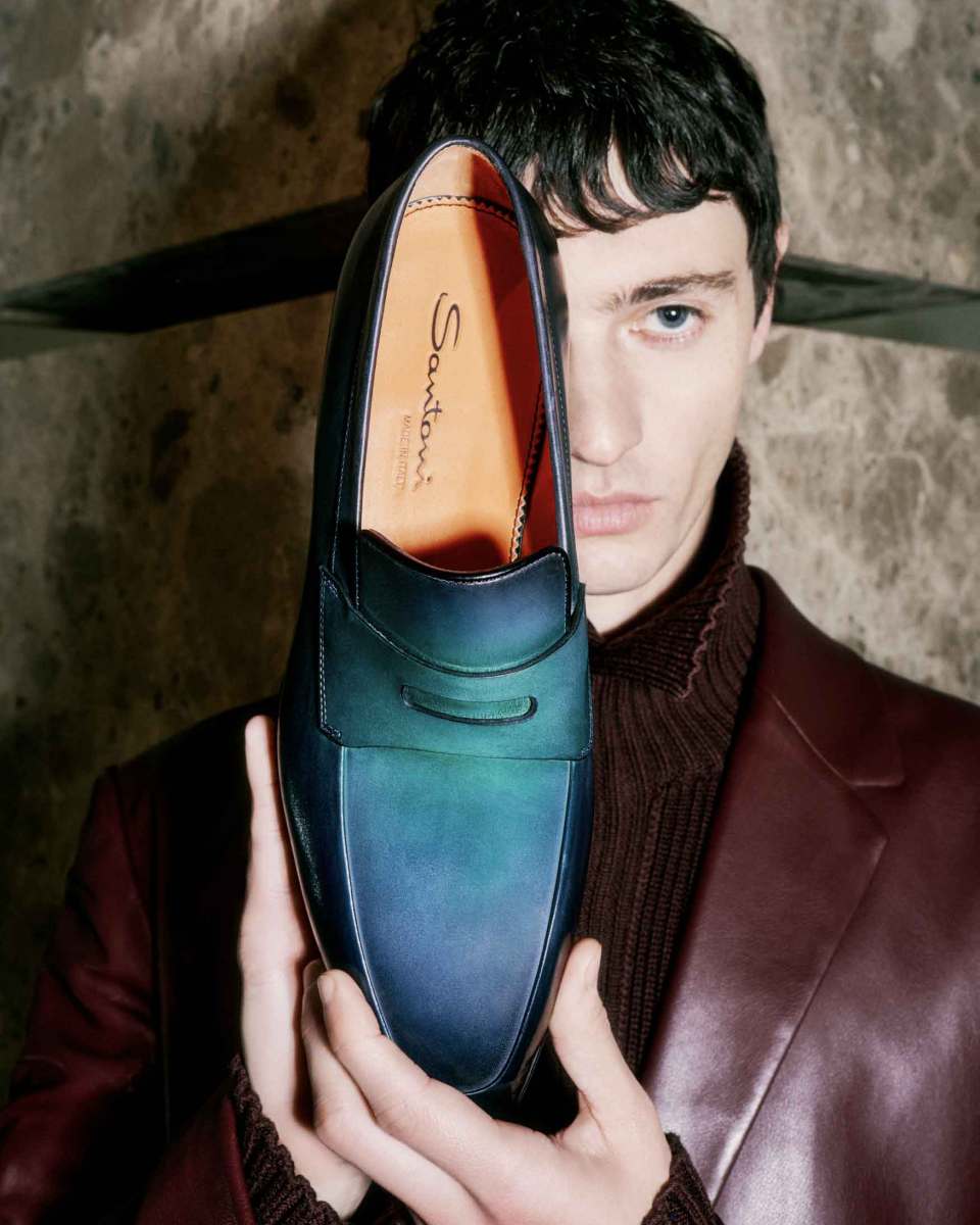 Tutte le creazioni firmate Santoni raccontano una storia cromatica che rispetta l’universo green. Le tonalità di marrone e il color cuoio si mixano alle tinte blu mare. Un’attenzione particolare va rivolta all’iconica doppia fibbia, vero e proprio fil rouge di tutta la nuova collezione Autunno/Inverno 2023-23. I vari modelli di mocassini si caratterizzano per le diverse sfumature di colore tramite cui vengono presentati, e la suola si presenta pratica ma leggerissima.