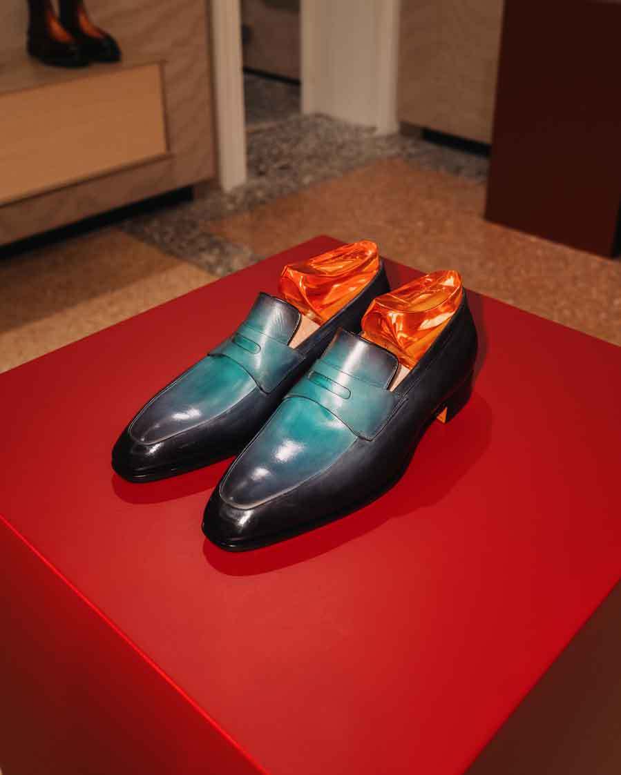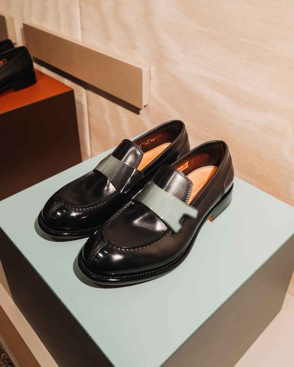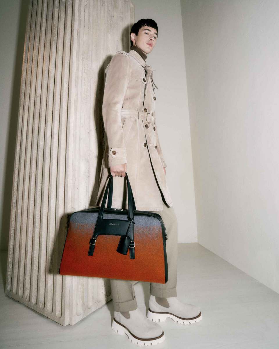 Tutte le creazioni firmate Santoni raccontano una storia cromatica che rispetta l’universo green. Le tonalità di marrone e il color cuoio si mixano alle tinte blu mare. Un’attenzione particolare va rivolta all’iconica doppia fibbia, vero e proprio fil rouge di tutta la nuova collezione Autunno/Inverno 2023-23. I vari modelli di mocassini si caratterizzano per le diverse sfumature di colore tramite cui vengono presentati, e la suola si presenta pratica ma leggerissima.