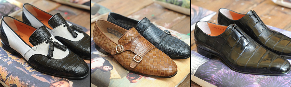 Per Santoni la ricerca artigianale ed estetica è massima, le forme si accorciano, le cuciture sono ridotte al minimo e la morbidezza dei materiali è visibile e tangibile. Modelli eleganti, a tratti retrò, per i mocassini bicolori; grandi protagoniste della collezione le monkstrap a due fibbie, presentate in una grande quantità di tonalità decise. Sandali in cuoio, stringate lineari e classiche e sneakers sfoderate bianco ottico per un’eleganza casual, inno alla sottrazione. I pellami sono preziosi (come pitone, cuoio e suède) e le lavorazioni a intreccio delle slippers donano un allure dégagé, ma mai scontata, a chiunque le indossi.