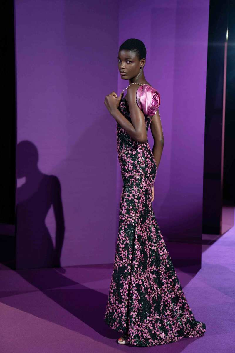 Una cascata floreale con lampi metallici e bagliori preziosi: è così che si presenta la collezione di alta moda di Alexis Mabille AI 21-22. Ventuno uscite che si avvicendano e si completano sullo sfondo di quinte e pavimento viola, un colore profondo ma al contempo brillante che permette a ogni capo di risaltare ancora di più.