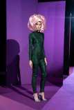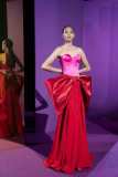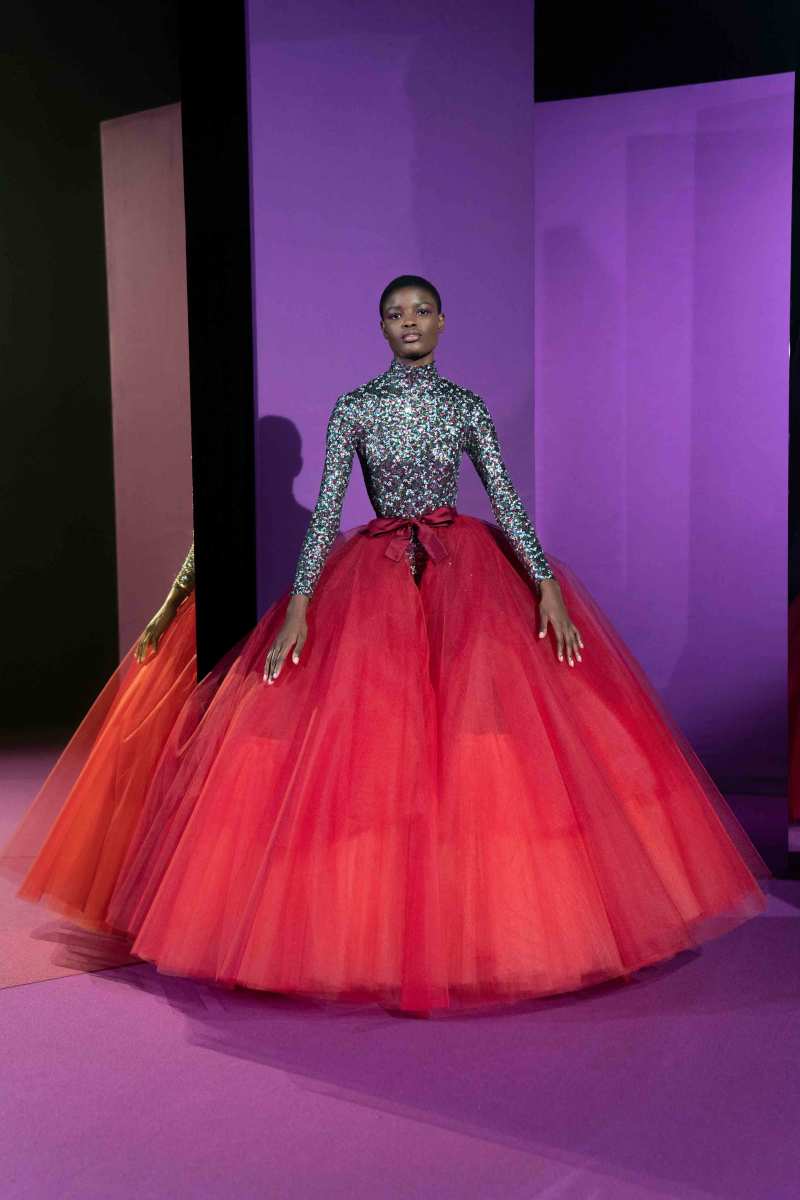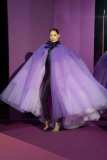 A chiudere la collezione, vaporose sopragonne in tulle rosa, viola e bordeaux, che ricordano giganteschi amarillidi. Un capo tanto sbarazzino quanto fastoso, da indossare legato in vita sopra le iconiche catsuit, oppure sulle spalle, come un mantello fuoriuscito da una fiaba floreale.