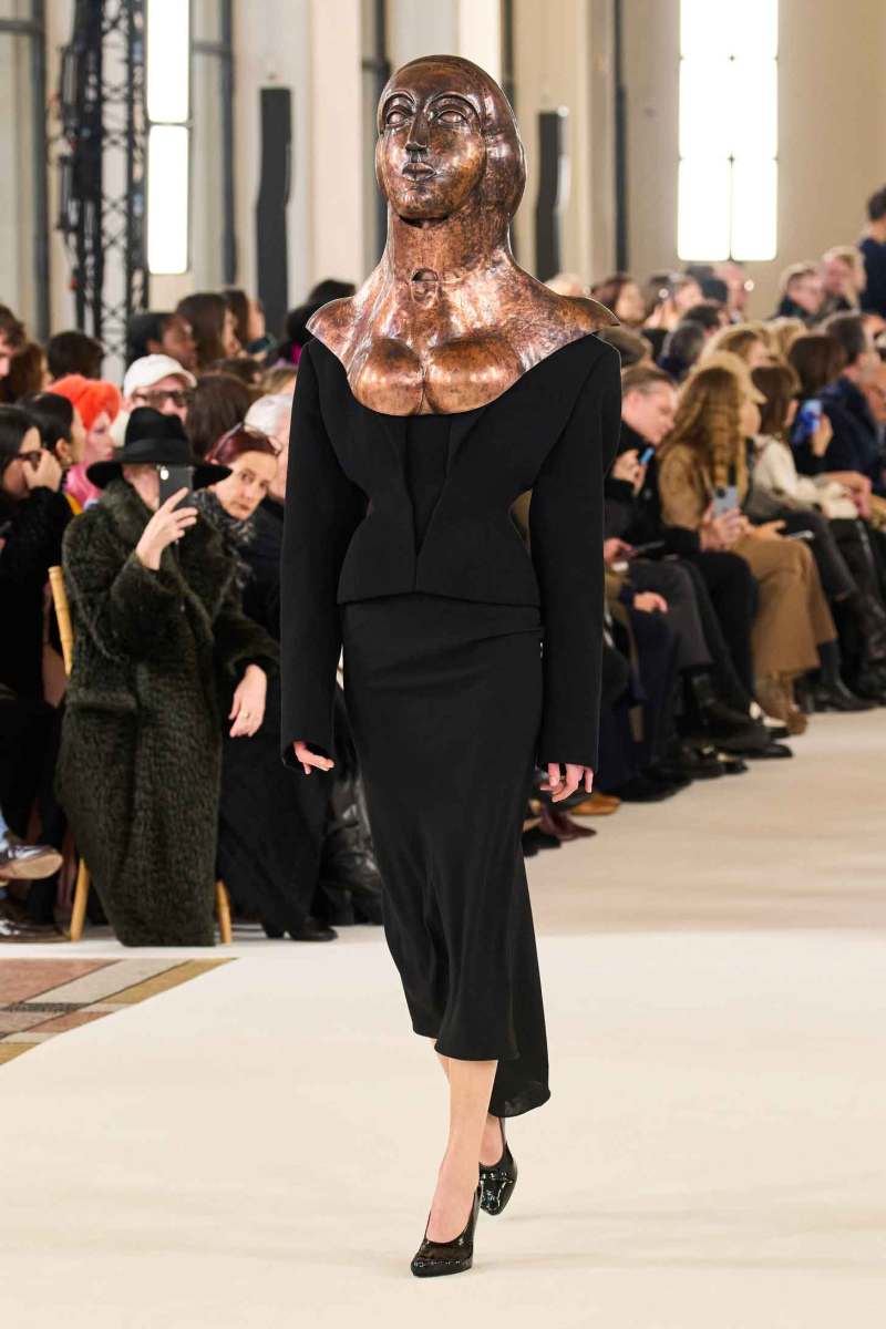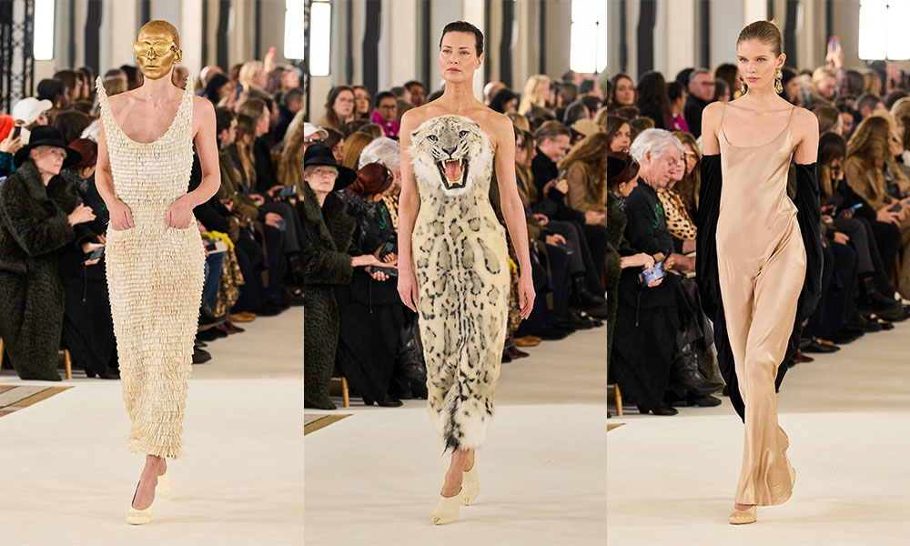Shalom Harlow interpreta la lonza, animale bianco delle nevi con la bocca spalancata, su un tubino senza spalline. Irina Shayk è accompagnata da una maestosa testa di leone posta su un abito in velluto nero, mentre la lupa nera è posizionata su un cappotto nero a pelo lungo che avvolge il corpo di Naomi Campbell. Sono la lussuria, la superbia e la cupidigia i peccati di Dante Alighieri che si mescolano nell’Alta moda parigina.
