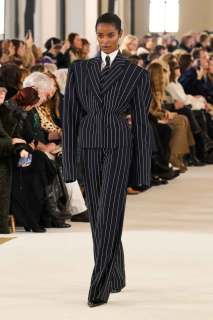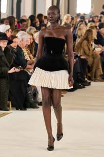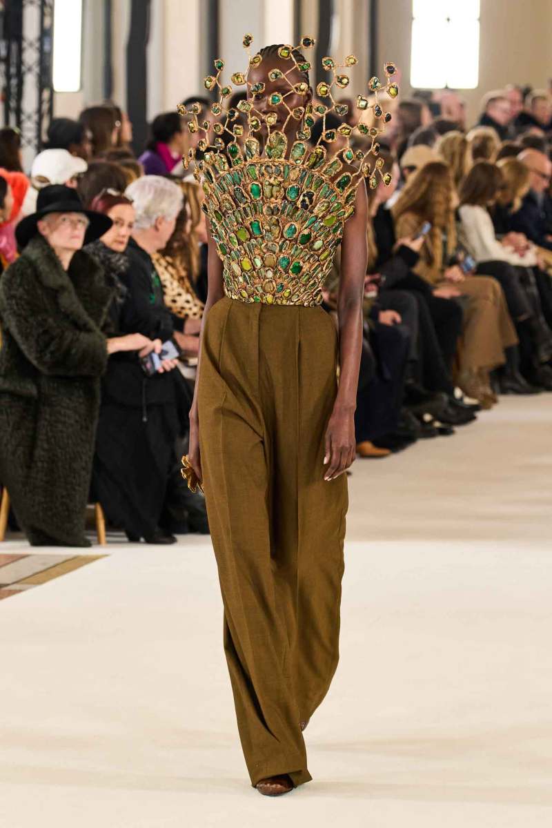 Il vero lavoro di Roseberry consiste nel saper confondere la realtà con la fantasia: abiti lunghi da sera e giacche, quindi, non sono altro che declinazioni di un lunghissimo lavoro di disegno e di atelier del corsetto. Infatti, è proprio dal corsetto che nascono le giacche dalle spalle importanti, le maniche allungate oltre le mani che si infilano a loro volta negli anelli dorati, come i bustier.