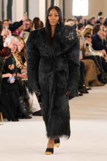Questi ultimi sono una scultura in velluto stretch che riprende la forma della boccetta del profumo Shocking disegnato per Elsa da Leonor Fini. Anche le giacche dei tuxedo vengono chiuse da un corsetto, come l’eco pelliccia tinta a mano in seta e lana indossata da Naomi.