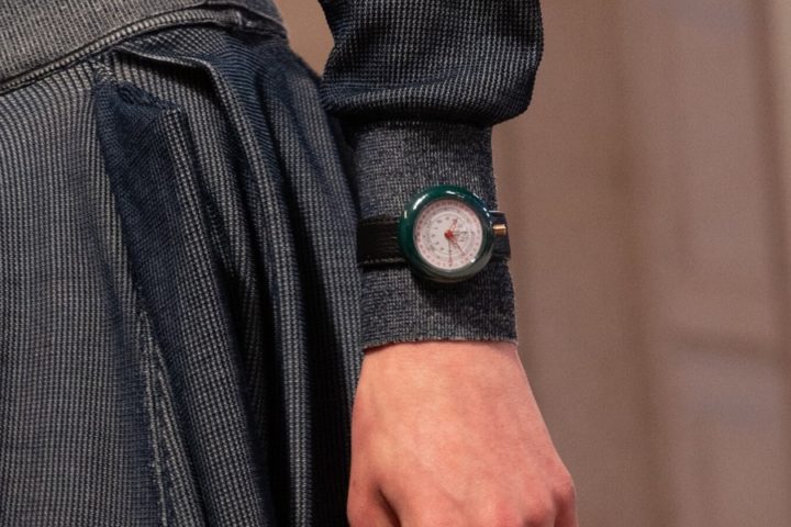 L’inizio della sfilata rappresenta un panorama innevato in Svizzera e il rapper Saul Williams che recita una narrazione. Successivamente si entra in un edificio minimalista, il Tennis Club de Paris, ricoperto da marmi bianchi e colorati che fungono da passerella. La scenografia si trasforma in una stazione in cui le persone arrivano, aspettano sedute, camminano, si siedono e si confondono tra loro.
