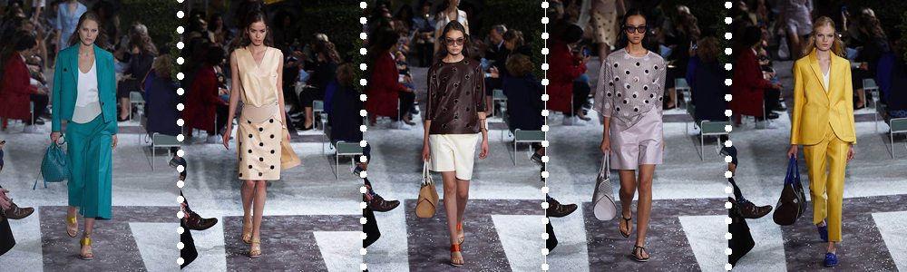 Cinture di pelle larghe e sottili abbracciano il punto vita, mentre le bags portate a mano sono da giorno sulle cromie del nero, bianco, beige, verde petrolio.